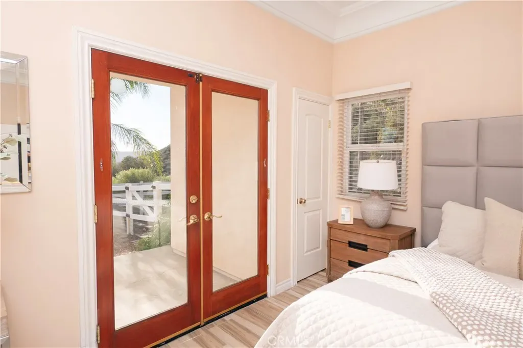 Welcome to your dream retreat situated on the scenic Santa Rosa Plateau in La Cresta. This stunning custom single-family residence sits on a sprawling 5 acre parcel, ensuring both privacy and tranquility while still enjoying the warmth of a close-knit community. Designed for comfortable, upscale living, this 3,317 sq ft home features an open floorplan, five spacious bedrooms, and three luxurious bathrooms — perfect for families of any size or those who love to entertain. Step into sophistication and charm with elegant 12-inch crown molding, high ceilings, and rich hardwood flooring throughout. The heart of the home is the expansive family and dining rooms, seamlessly connected by a dual fireplace that creates an inviting atmosphere for gatherings. An additional fireplace in the living room adds warmth and ambiance to your evenings. The gourmet kitchen will delight the home chef with Corian countertops, a center service island with breakfast bar and ample space for culinary creativity. Whether you’re preparing everyday meals or hosting festive celebrations, this kitchen is designed to inspire. Ideal for multi-generational living, the attached “Next Generation” unit provides comfort and independence. Complete with a full bathroom and a kitchenette, it is perfect for extended family or guests. Embrace the beautiful California outdoors from the expansive rear deck, offering breathtaking views of rolling hills and picturesque countryside. The primary suite features a private covered viewing deck, creating a personal sanctuary to enjoy sunrises, sunsets, and peaceful moments. The property includes a fenced area suitable for raising chickens or goats which can easily be converted for horses, making it a perfect fit for animal lovers or hobby farmers. Enjoy the bounty of your own land with a variety of mature, fruit-bearing trees such as peach, persimmon, apple, and fig. La Cresta is renowned for its vibrant social life and supportive family-centered community, yet the 5 acre parcel minimum ensures the ultimate in privacy and seclusion. Here, you have the freedom to relax, explore, and enjoy life at your own pace — all while remaining connected to neighbors and local activities. This extraordinary estate offers the rare combination of luxurious living, multi-generational flexibility, and rural charm. Experience the best of Southern California in a home that truly has it all — space, elegance, and a setting that welcomes both relaxation and adventure.