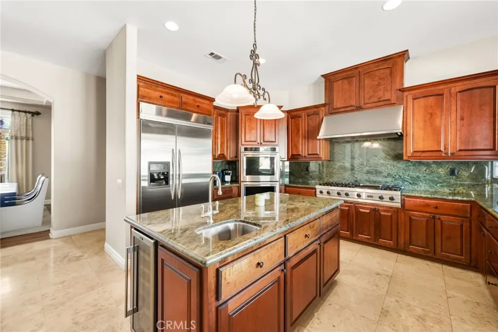 Inside, you’ll find 10-foot ceilings, 8-foot solid mahogany doors, and 18-inch travertine flooring. The gourmet kitchen is designed for both everyday living and entertaining, with cherry cabinetry, a spacious island with prep sink, wine refrigerator, and premium appliances including a Viking cooktop, KitchenAid double convection ovens, built-in refrigerator, and dishwasher. Formal living and dining room areas feature walnut floors and coffered ceilings with ambient lighting. The primary suite offers a spa-like walk-in shower, jetted soaking tub, dual closets, and elegant finishes. Spend time in the 1,130-square-foot 3 car garage that includes a workbench, attic access, unique ceiling fan, and a 30-foot depth to easily accommodate large trucks.