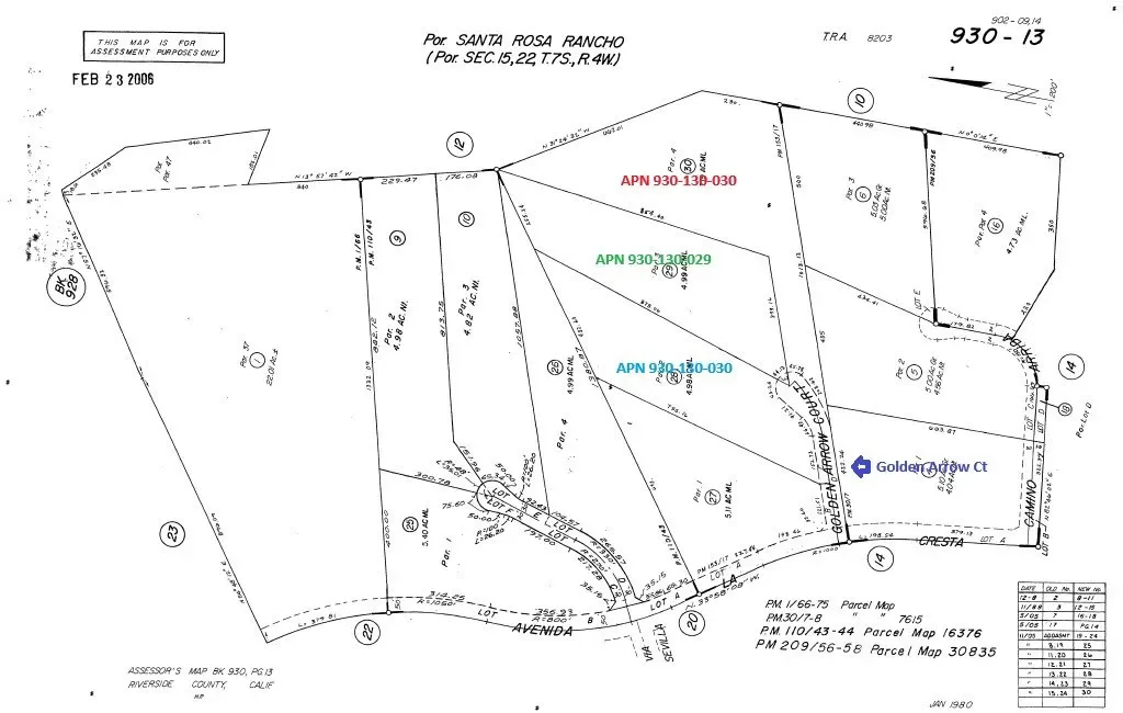 La Cresta Community & Lifestyle. This is your opportunity to acquire lot APN 930-130-029 (4.99 acres) or all three contiguous parcels in the highly sought-after La Cresta community of Murrieta. Available lots include APN 930-130-028 (4.98 acres), APN 930-130-029 (4.99 acres), and APN 930-130-030 (7.19 acres), totaling approximately 17.16 acres. The properties are located just off Avenida La Cresta with access via Golden Arrow Ct (buyer to verify access, road improvements, and maintenance). La Cresta is renowned for its estate-sized parcels, custom homes, and equestrian-friendly zoning, offering a rare blend of privacy, natural beauty, and open space. Residents enjoy close proximity to the scenic Santa Rosa Plateau Ecological Reserve with miles of hiking, horseback riding, and preserved landscapes, as well as convenient access to the award-winning wineries of Temecula Valley. The area is known for its peaceful rural atmosphere while still being approximately 10–15 minutes from the I-15 corridor via Clinton Keith Road. Each parcel offers the potential for views, star-filled night skies, and the opportunity to create a private estate retreat.
