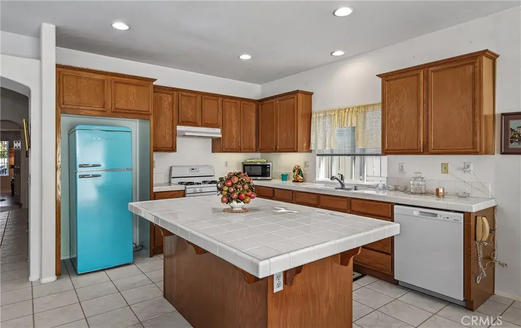 Upon entry, you’re greeted by tile flooring throughout most of the home and a separate living and dining area that seamlessly flows into a spacious kitchen featuring a center island, ample cabinetry, and an open connection to the large family room with a cozy fireplace. Sliding glass doors lead to a private backyard—perfect for relaxing or entertaining.