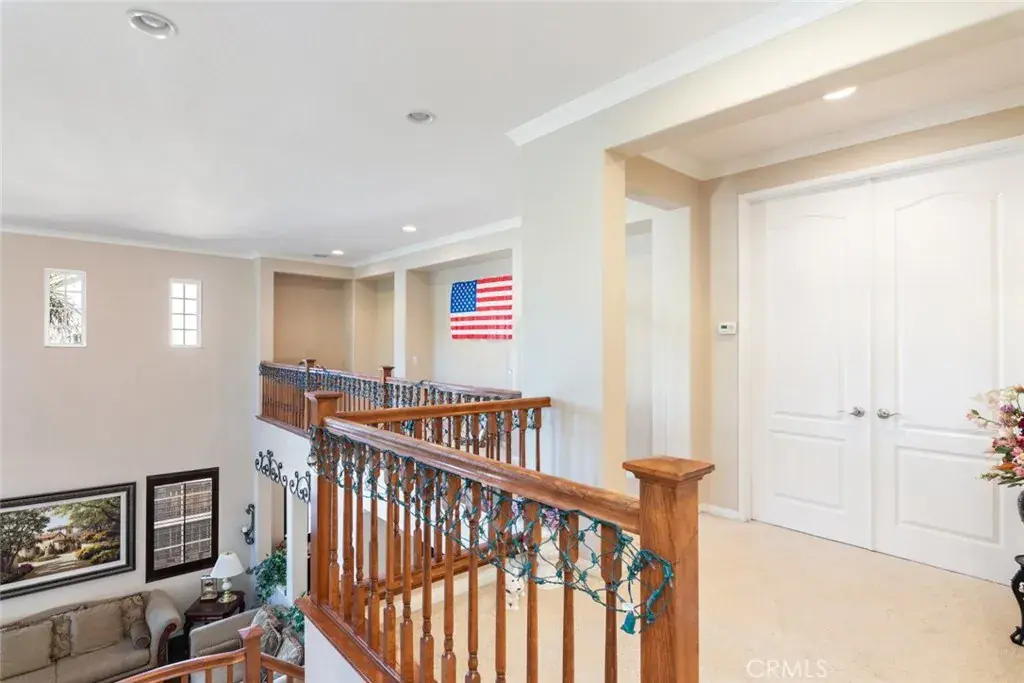 Soaring vaulted ceilings, plantation shutters, and elegant crown molding add to the home’s refined style. A grand double staircase welcomes you from the formal living room and leads upstairs. The main level features wood and tile flooring, while the upstairs bedrooms are comfortably carpeted.