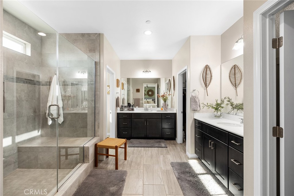 Beautifully upgraded 5-bedroom, 3.5-bath executive home located on a quiet cul-de-sac in highly sought-after Spencer’s Crossing, just minutes from the Oasis Pool. This spacious 3,411 sq ft home features an open-concept kitchen with quartz counters, ceramic stone backsplash, pendant lighting, soft-close drawers, stainless steel appliances, and a vented pyramid cooktop. The great room offers dual 12-foot sliding glass doors and upgraded finishes throughout. Downstairs includes a private bedroom, with glass French doors. Additional upgrades: luxury vinyl plank flooring on the first floor, plantation shutters throughout, upgraded stair railing, and paneled interior doors. The oversized primary suite boasts a walk-in closet, en-suite bath with walk-in tiled shower, dual vanities, and added privacy door. Upstairs includes a spacious loft, 3 secondary bedrooms, and a laundry room with sink and added shelving. Low-maintenance backyard with extended patio cover and a stock tank pool—perfect for summer. Home includes PAID solar, whole-home water softener, and a 3-car garage. Spencer’s Crossing offers pools, parks, walking trails, and top-rated schools. Move-in ready!