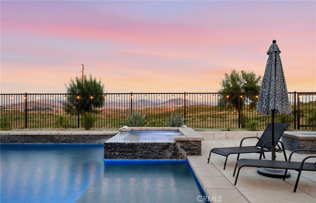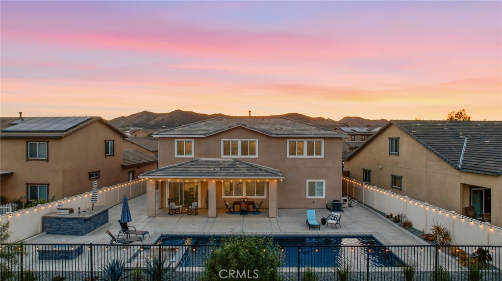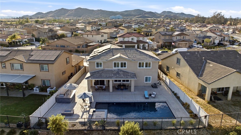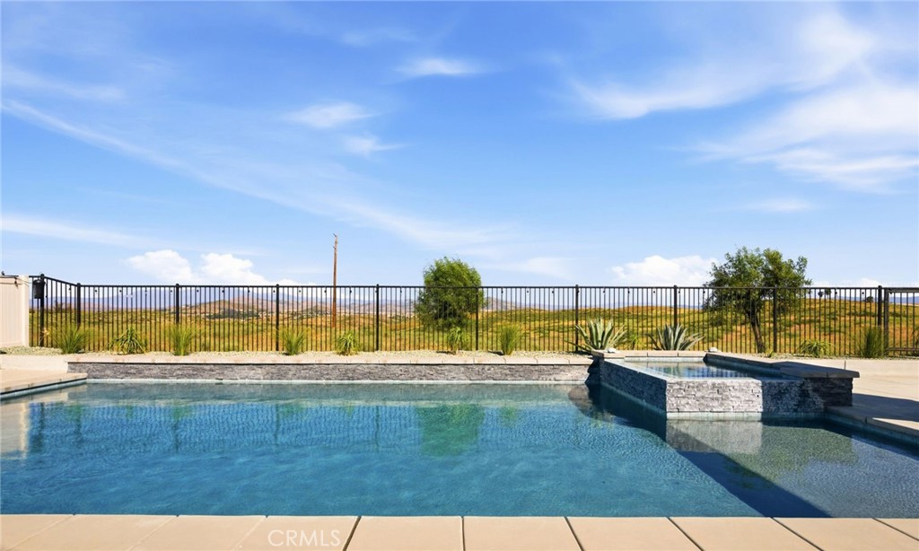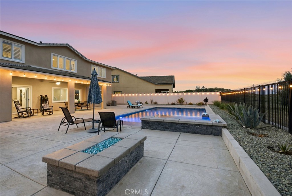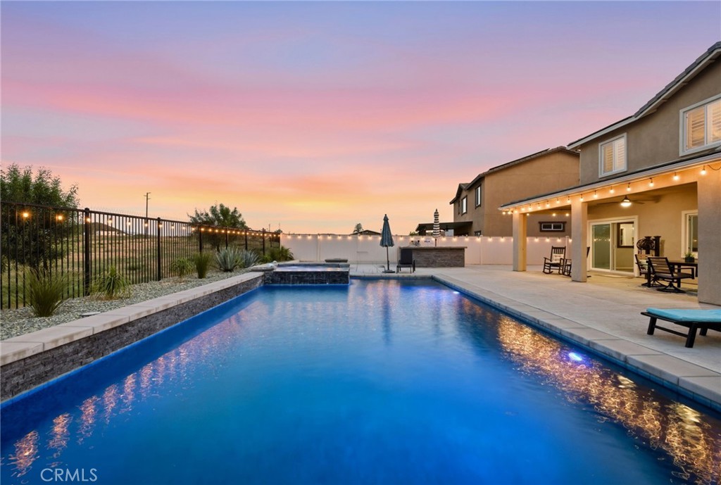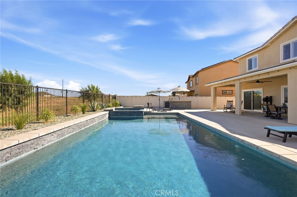 Step into your own resort-style backyard featuring a custom-built saltwater pool and spa, complete with Pebble Tec finish, heated system, Baja shelf, 8.5-foot depth, and an impressive 33,000-gallon capacity. Enjoy multiple water features including a spillover jacuzzi and tranquil waterfalls, all powered by Pentair smart equipment with full mobile control. Designed for entertaining, the outdoor space boasts stamped concrete, drought tolerant landscaping, a covered patio with integrated lighting and fans, a gas fire pit, and a stunning stone BBQ island equipped with a refrigerator, sink, and premium Bull gas grill.