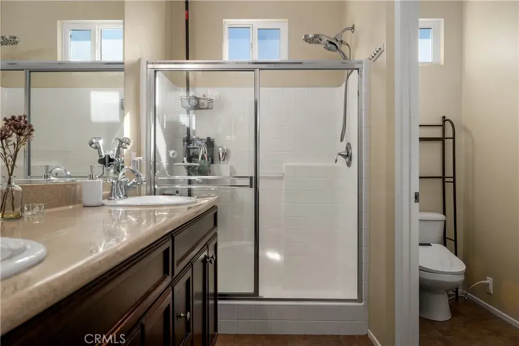 Upstairs, the primary suite offers a peaceful retreat with a private bathroom featuring dual sinks, a walk-in shower, and a walk-in closet. Down the hall, you’ll find two generously sized guest bedrooms and a full bathroom with a tub/shower combo, perfect for family or guests.