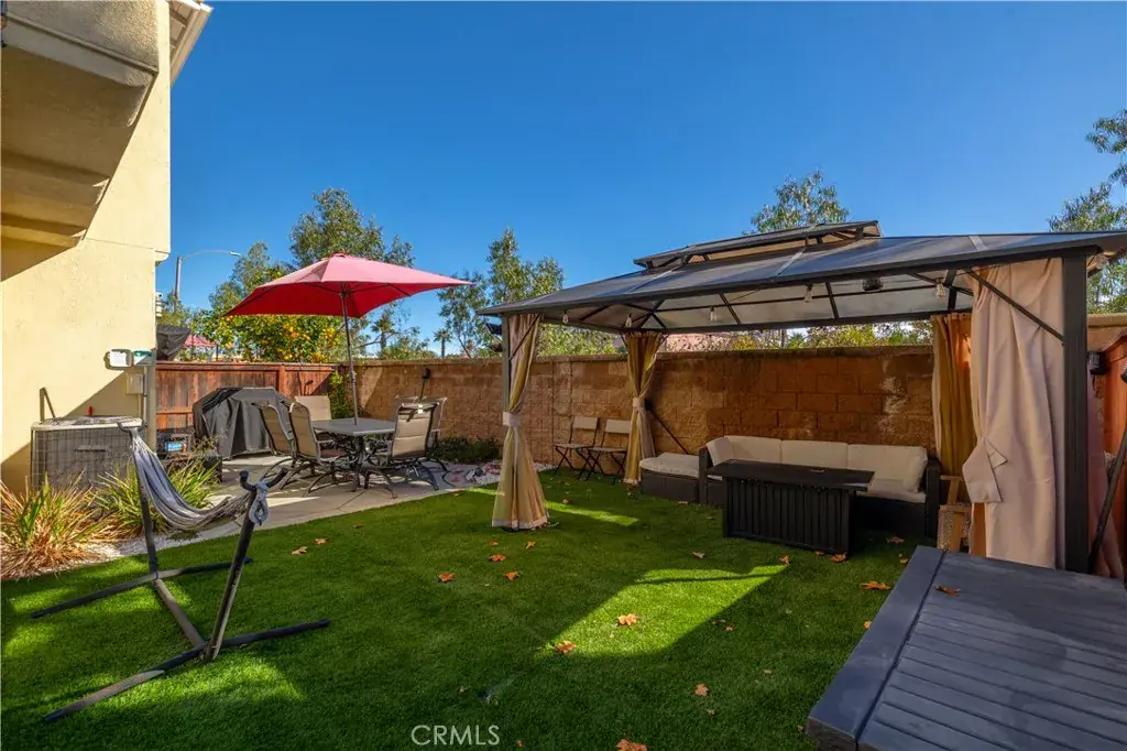 Step outside to your private backyard oasis, complete with artificial turf, a concrete patio, and a gazebo included for shade—ideal for outdoor dining, playtime, or unwinding after a long day.