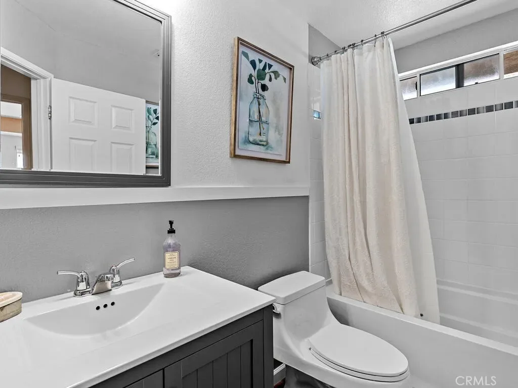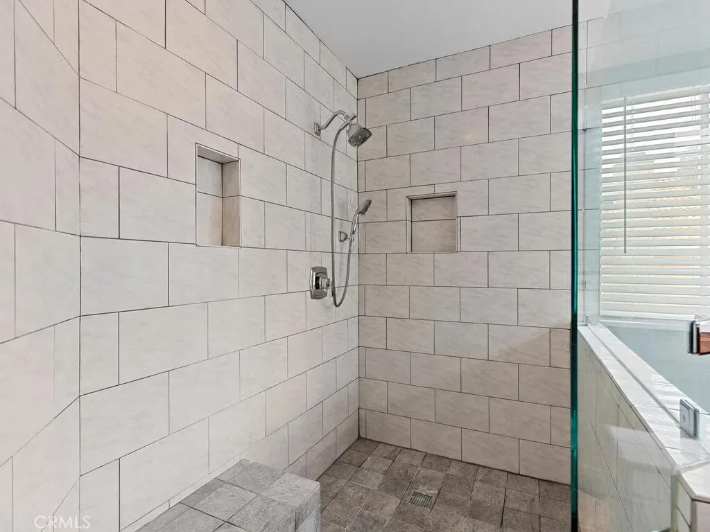 Upstairs, the expansive primary suite offers two closets, including a large walk-in closet with double doors. The remodeled primary bathroom features a huge walk-in shower with dual shower-heads, double sinks, and a vanity area.