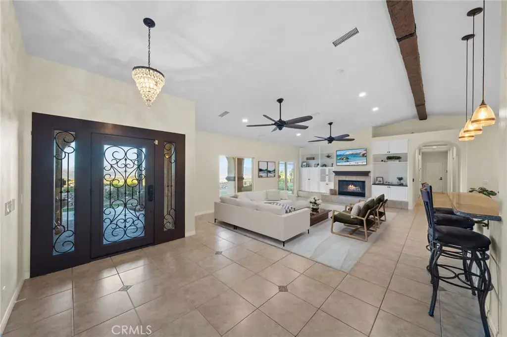 sweeping mountain and city-light views. From the moment you walk in, the open floor plan, vaulted ceilings, wood beams, and
