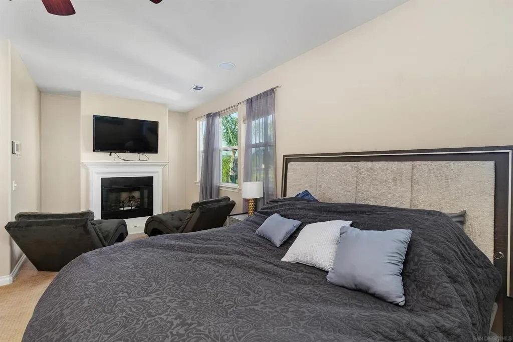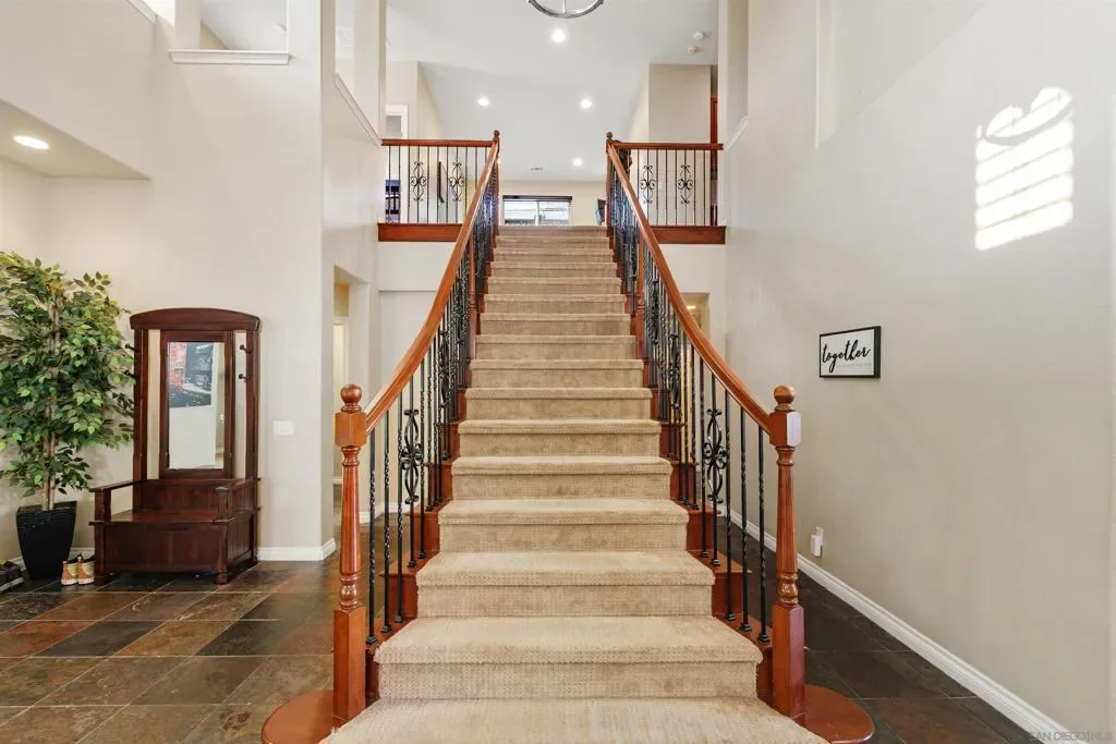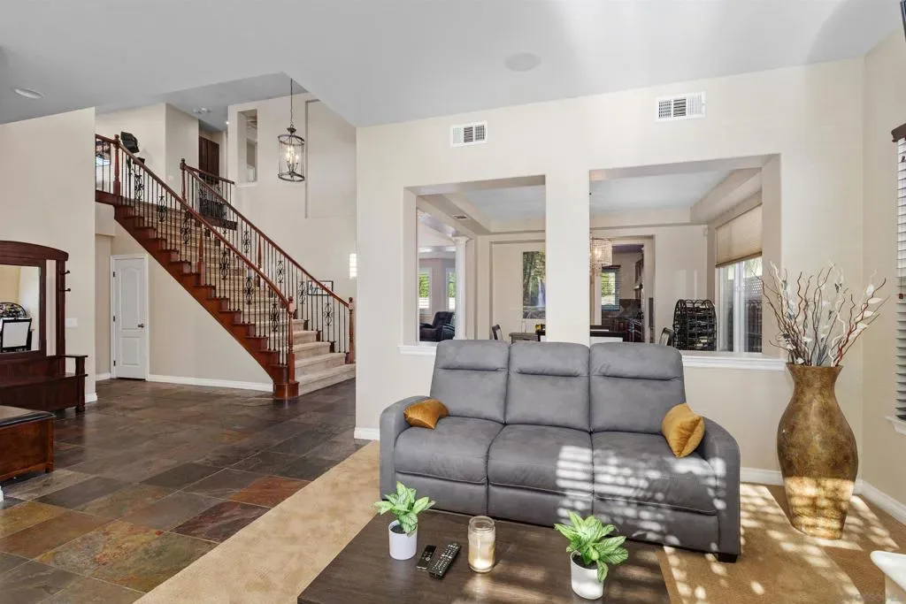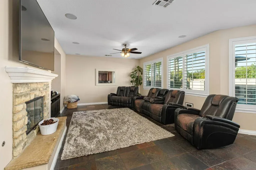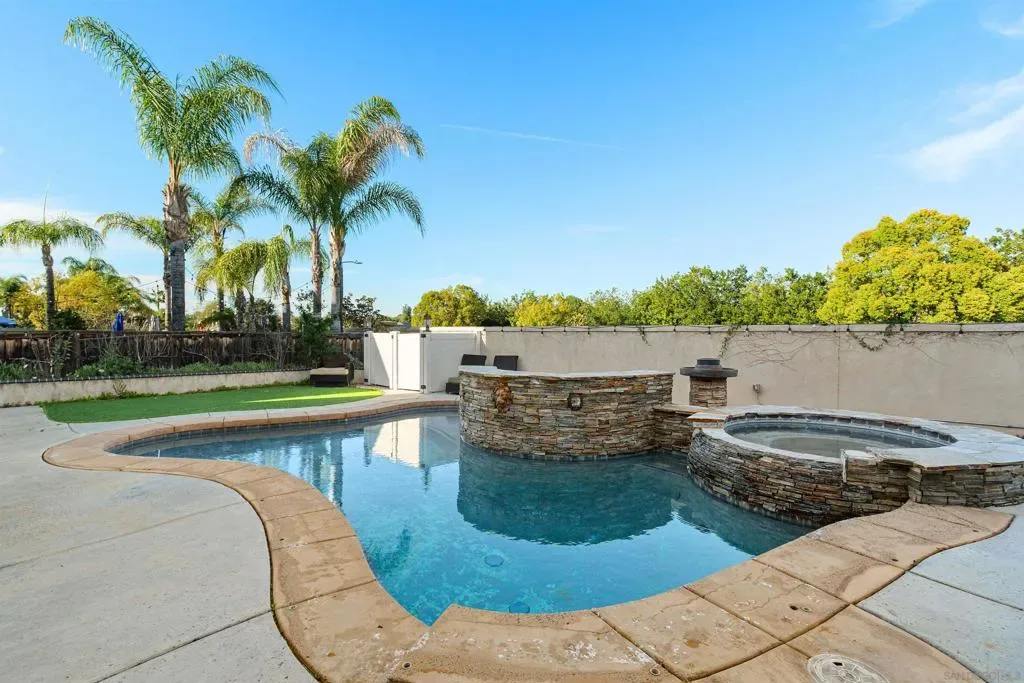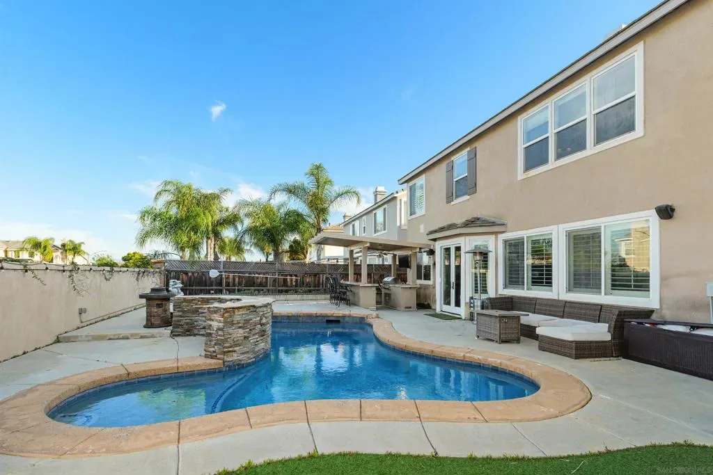 West Murrieta Pulte home is approximately 4,042 square feet and features seven bedrooms and four and a half bathrooms. Two of the seven bedrooms with one full and one-half bath are located on the ground floor, offering versatility and convenience. The upstairs primary bedroom is a spacious retreat with its own sitting area, fireplace, large walk in closet and en-suite bathroom with jetted tub, heated floors. Throughout the home, you’ll find recessed lighting, ceiling fans that contribute to the overall refined aesthetic. The interior boasts a spacious dining area with an elegant chandelier, offering a refined setting for dining and entertaining. One upstairs bedroom is a dedicated home theatre. The home’s expansive living area is filled with abundant natural light, creating a warm and welcoming ambiance. The cozy fireplaces in living and family rooms adds a touch of coziness and comfort to the spaces. The kitchen is well-equipped upgraded appliances, ample cabinetry and sleek granite countertops, providing plenty of storage and preparation space. The backyard is a true oasis, boasting a spacious layout with an inviting patio and a sparkling pool, perfect for outdoor living and entertainment. Walking distance to top-rated Thompson Middle School and Murrieta Valley High School, with nearby hiking/biking trails, Santa Rosa Plateau, convenient freeway access, local shopping, dining, and the charm of Old Town Murrieta.