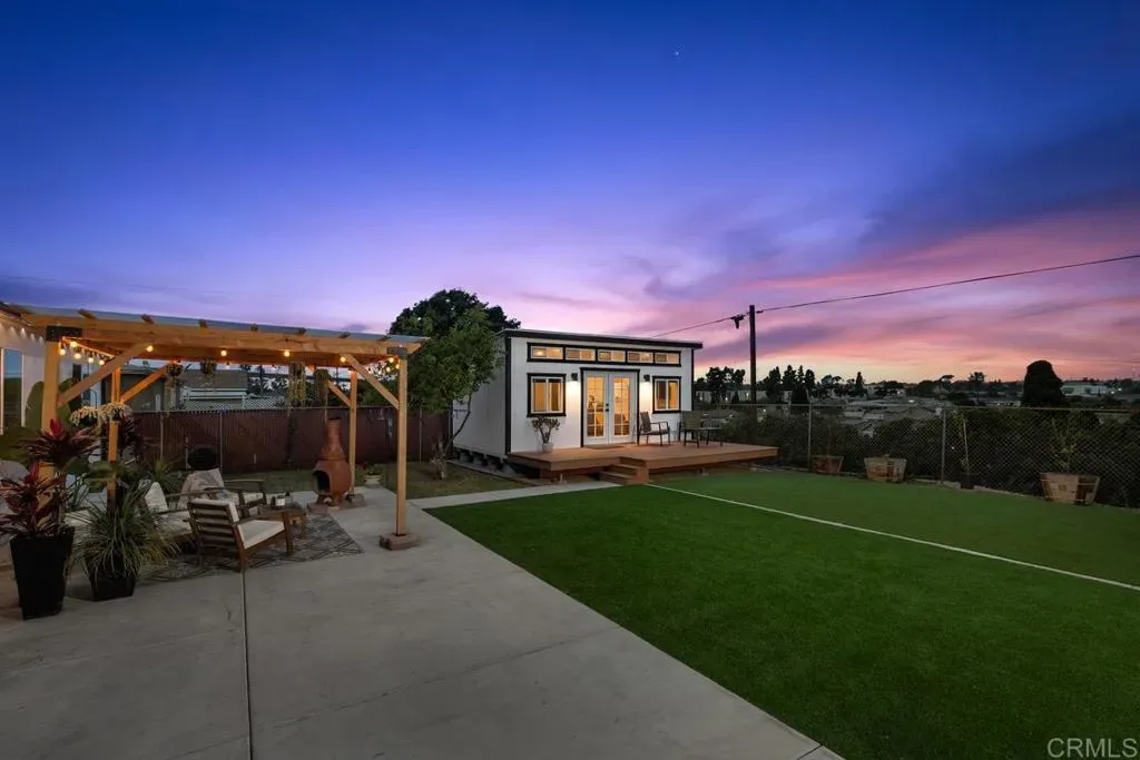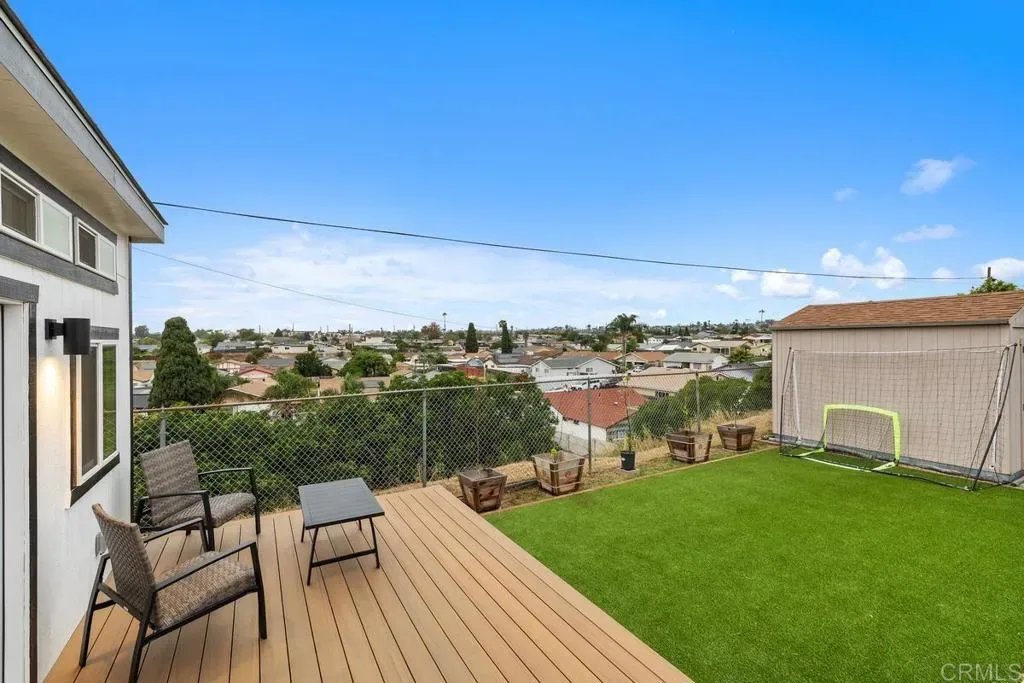 Assumable VA loan at 5.25% for qualified buyers. Beautifully upgraded single-level home featuring 3 bedrooms and 2 bathrooms across 1,064 sq ft, situated on an expansive approx. 8,300 sq ft lot designed for comfort and functionality. Light-filled interior showcases newer flooring, recessed and designer lighting, ceiling fans in each bedroom, and an open-concept layout centered around a spacious kitchen island with quartz countertops, new cabinetry, and stainless steel appliances. The primary suite offers a dual-sink vanity and walk-in shower, while both bathrooms have been tastefully updated with modern finishes. Additional upgrades include a newer roof and energy-efficient mini split systems for customized heating and cooling. The backyard is ideal for everyday living and entertaining, featuring low-maintenance turf, a covered pergola sitting area, and a storage shed. The property also includes a detached structure of approximately 250 sq ft with sleeping area, bathroom, kitchenette, mini split system, and private deck, ideal for guest quarters, office, or studio. A versatile, turnkey opportunity with flexible living options. Conveniently located near shopping, recreation, beaches, major highways, and all that San Diego has to offer.