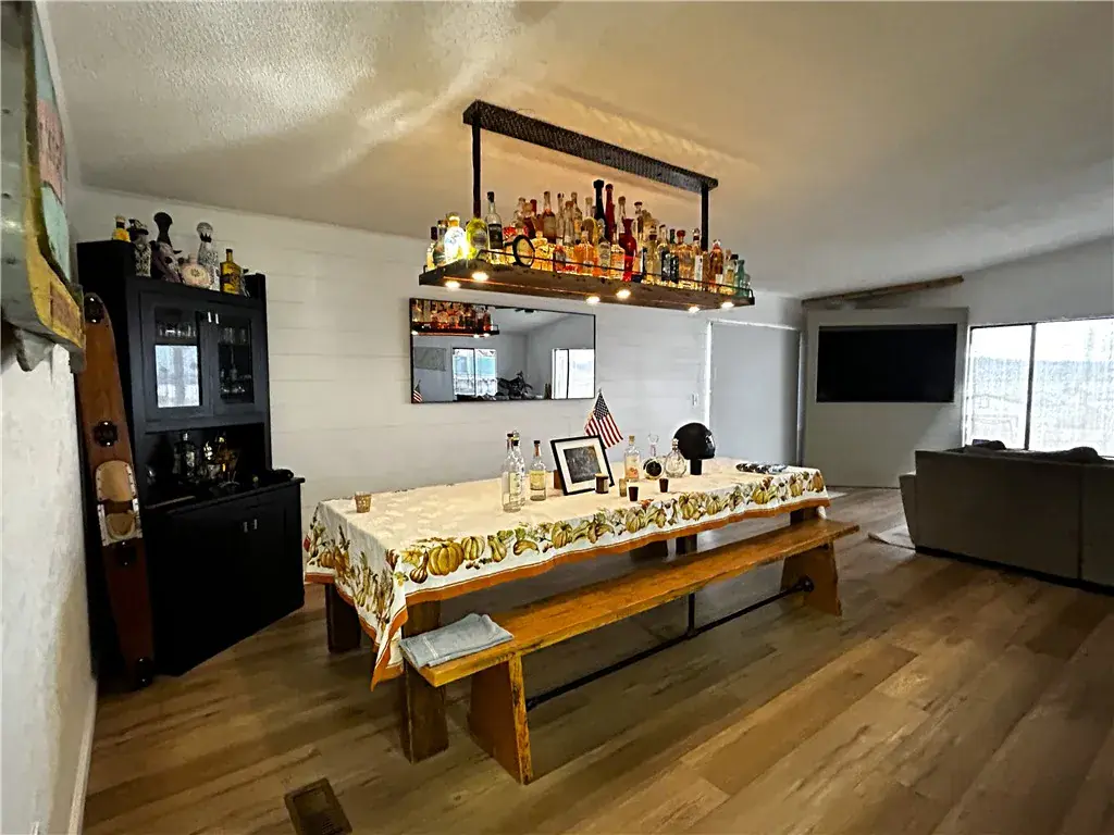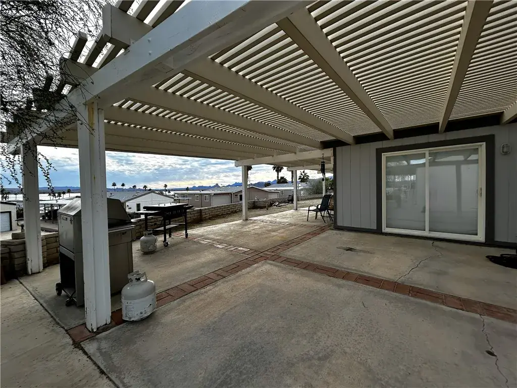 This is a modern, highly customized desert resort home. It features a bright, updated interior with an open-concept kitchen and a “rustic-modern” living room area accented by heavy timber beams and custom wood. The property is unique with an oversized tandem garage for off-road vehicles and an expansive pergola-covered patio with elevated views of the mountains and lake.