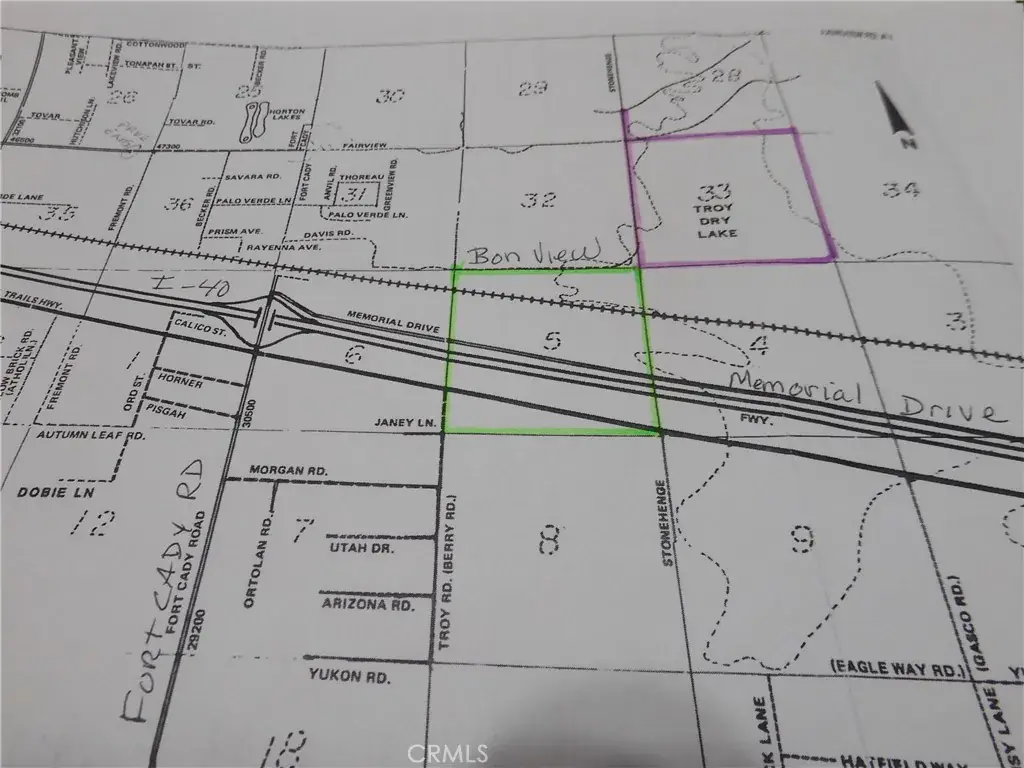 557.77 acres in Newberry Springs. It consists of 4 parcels, stacked on top of each other, that make up an entire Section of land minus the easements for US Hwy 66/National Trails Hwy, I-40, Memorial Drive & the railroad easements. All 4 of these parcels are 1 mile long from east to west. The most southerly parcel, APN 0529-151-09, is 27.26 acres. The north line of this parcel has frontage on the south side of US Hwy 66. It begins at Berry Rd (AKA Troy RD) and continues east 1 mile to Stonehenge Rd. The next parcel going north, APN 0529-151-08, is 129.51 acres. It also begins at Berry Rd (AKA Troy RD) and continues east 1 mile to Stonehenge Rd. It’s the land between National Trails Hwy and Eastbound I-40. The next parcel going north, APN 0529-151-07, is 44.31 acres. It’s the parcel between Westbound I-40 and Memorial Drive and is also 1 mile from east to west. And last but not least, the 4th parcel going north, APN 0529-151-06 is 373.53 acres. It has frontage on the north side of Memorial Drive and goes all the way north past the railroad to Bon View Ave. The NW corner of this parcel is at the SW corner Bonview Ave & Troy Rd. All 4 parcels together total 577.77 acres, allowing plenty of space & so many options. Solar farm, housing development, crops, livestock or all of the above could be achieved. Crops such as Pistachios, Apricots, Avocado, Peppers, Pomegranite & other crops do well in this area. Buyer to verify zoning & availability of electricity. Residents in the area use private wells, septic systems & propane as there are currently no public services for water, sewer or gas. Electric should be available all along US Hwy 66/National Trails Hwy. DIRECTIONS: From Barstow, take I-40 towards Needles. Take the Fort Cady Rd. Exit, get on US Hwy 66, continue east 1 mile to Troy Rd. (AKA Berry Rd). You will be at the approximate NW corner of the of the most southern parcel. Continue another mile east on Us Hwy 66 to the approximate NE corner of the most southern parcel. To view the parcels on the north side of I-40, go back to Fort Cady Rd, turn right right & cross over I-40, turn right on Memorial Drive and go 1 mile. The property will be on your right & on your left.