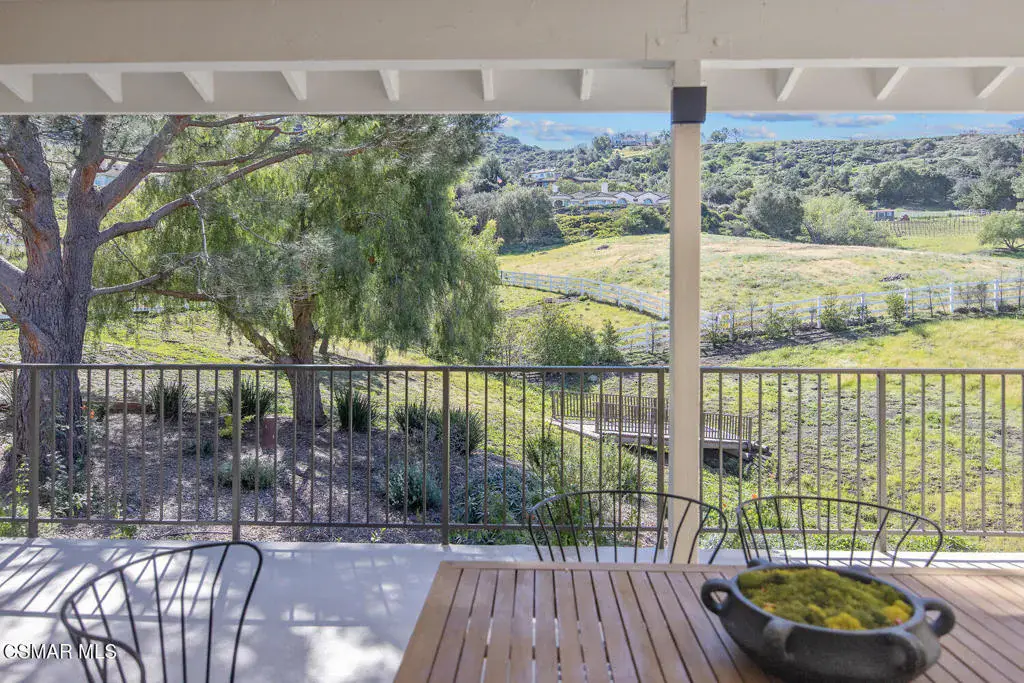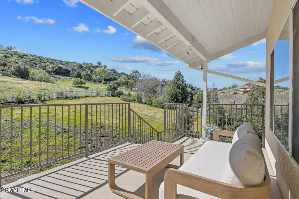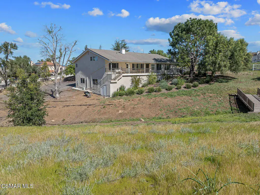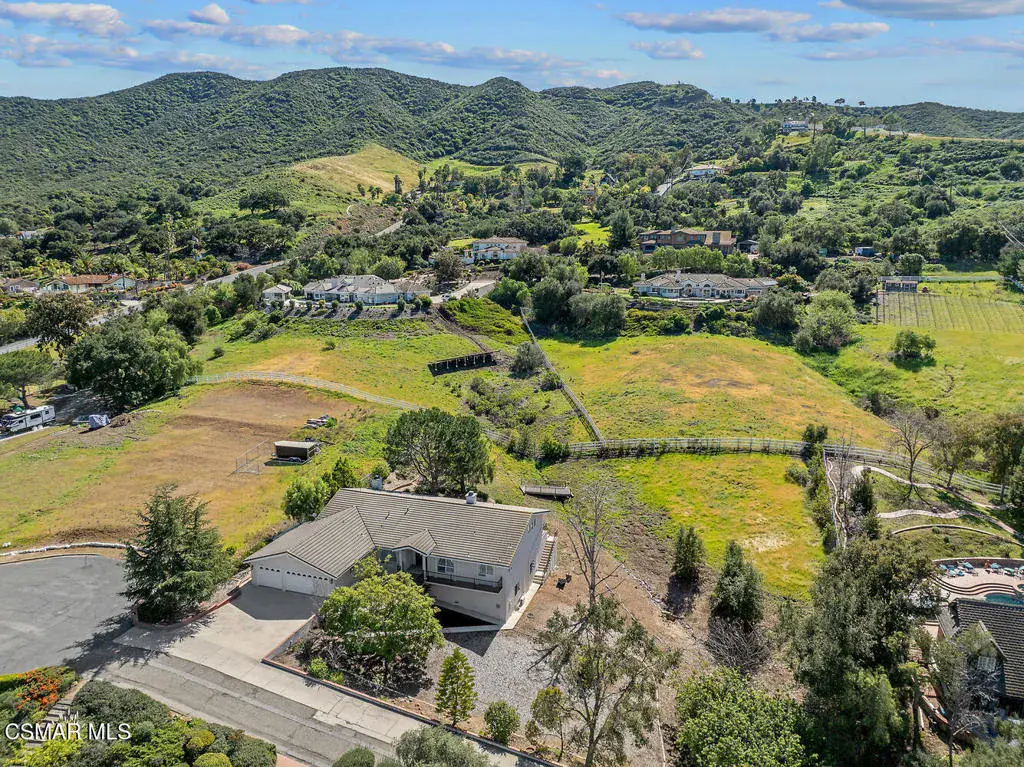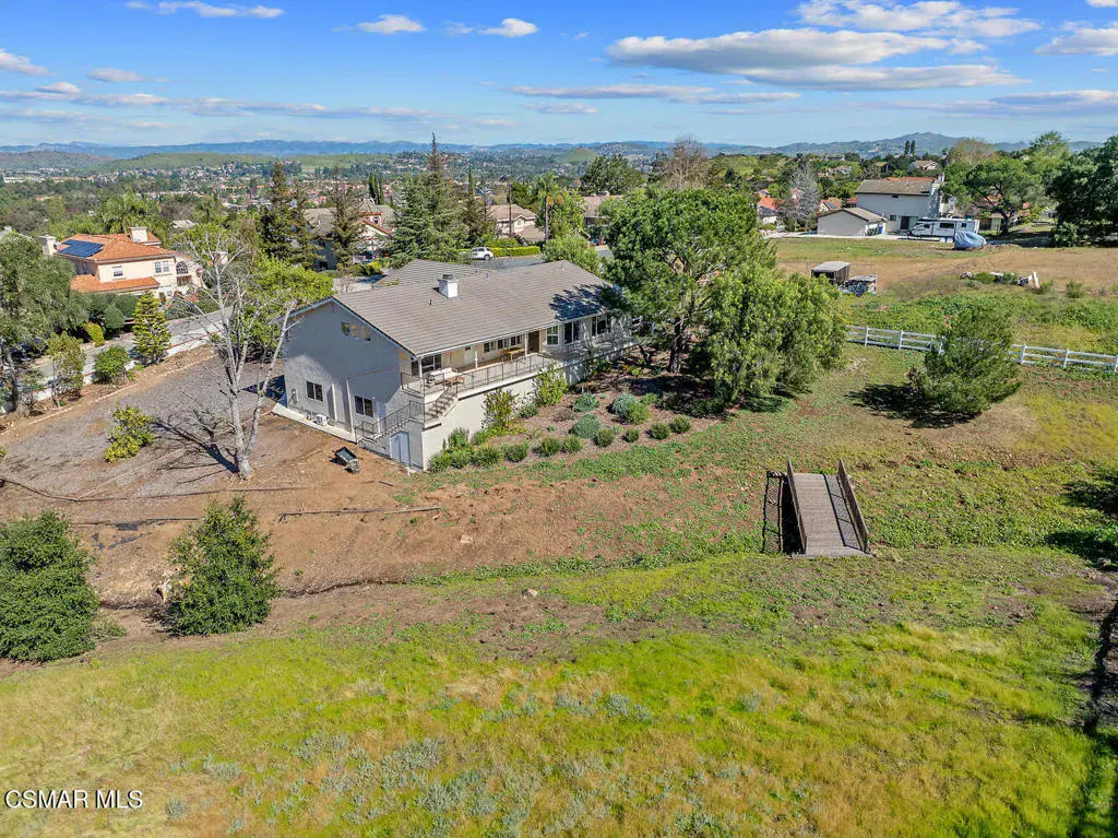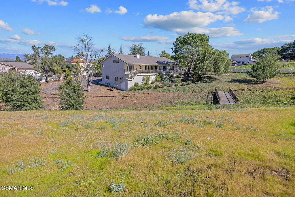This ONE-STORY custom estate has VIEWS so spectacular they look like a painting. Sitting on a ONE ACRE lot with stunning pastoral and mountain views from almost every room, this one-of-a-kind home is beautiful, unique and private. Enter the spacious living room with soaring vaulted ceilings, a cozy fireplace, and a wall of windows looking right out onto those panoramic views. Enjoy your coffee in the morning or a glass of wine at sunset out on the wrap-around deck while you take in the views of the pastures, mature trees, lush landscaping, and even a charming bridge and a creek that runs through the backyard. This yard is so large there is room for up to two horses, a barn, a large pool, and/or an ADU. Plus, below the one-story home there is a HUGE 500 sq ft BONUS ROOM with a separate entrance. This bonus space has endless possibilities such as a guest room, office, art or music studio, or an ADU (granny flat). As an additional bonus, under the home there is also a huge additional enclosed storage area, and plenty of room for additions.The main home features beautiful real Carrara marble floors throughout, new designer lighting, and plantation shutters. Enjoy cooking in the large gourmet kitchen with a huge island, tons of cabinets, and granite countertops that are gorgeous and still contemporary. The kitchen opens to the sizeable great room with a fireplace, eating area, groovy bar for entertaining, and a door out to the patio looking out to the most beautiful scenes. The primary bedroom is a peaceful retreat complete with high ceilings, spectacular views, his and herswalk-in closets, and a large en-suite bathroom with dual vanities, stall shower, and a soaking tub. Generously sized secondary bedrooms are complemented by two additional bathrooms, offering comfort and flexibility for family and guestsalike. The brand-new wraparound deck/porch provides the perfect setting to take in the spectacular scenery of the surrounding mountains and evening lights, while an outdoor pergola with electricity creates an ideal space for relaxing, or hosting. This home also has a HUGE storage space underneath the home, and a new security system. With its unparalleled views, usable acreage, and seamless indoor-outdoor flow, this one-of-a-kind property delivers privacy, beauty, and exceptional versatility in a truly unforgettable setting.
