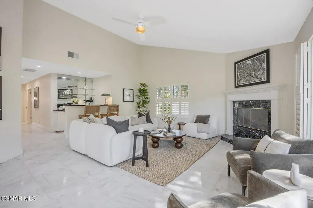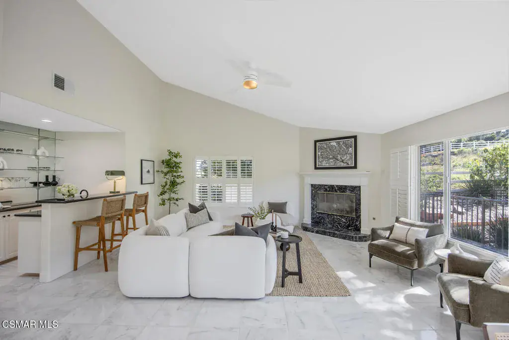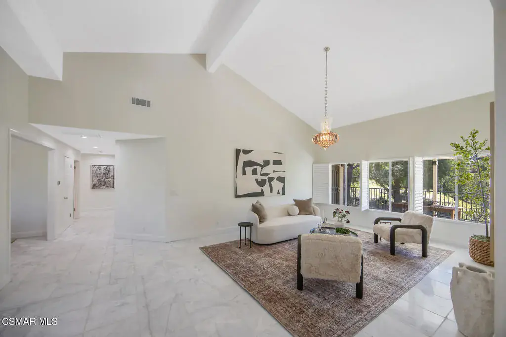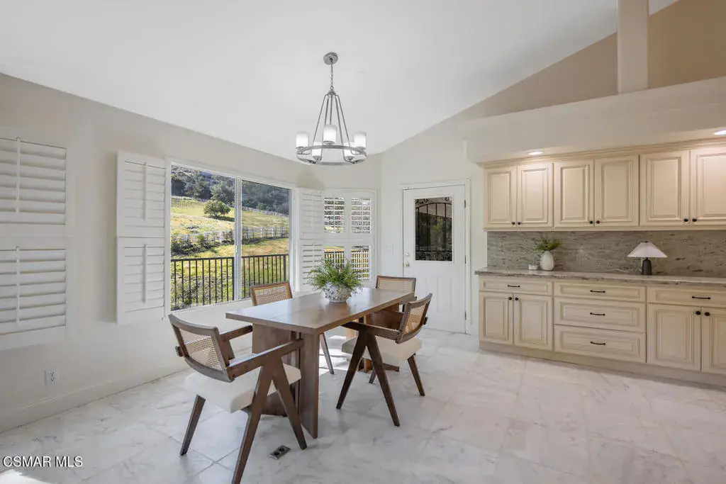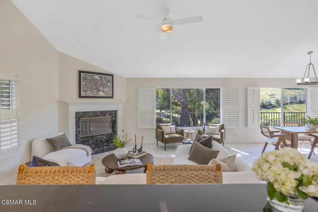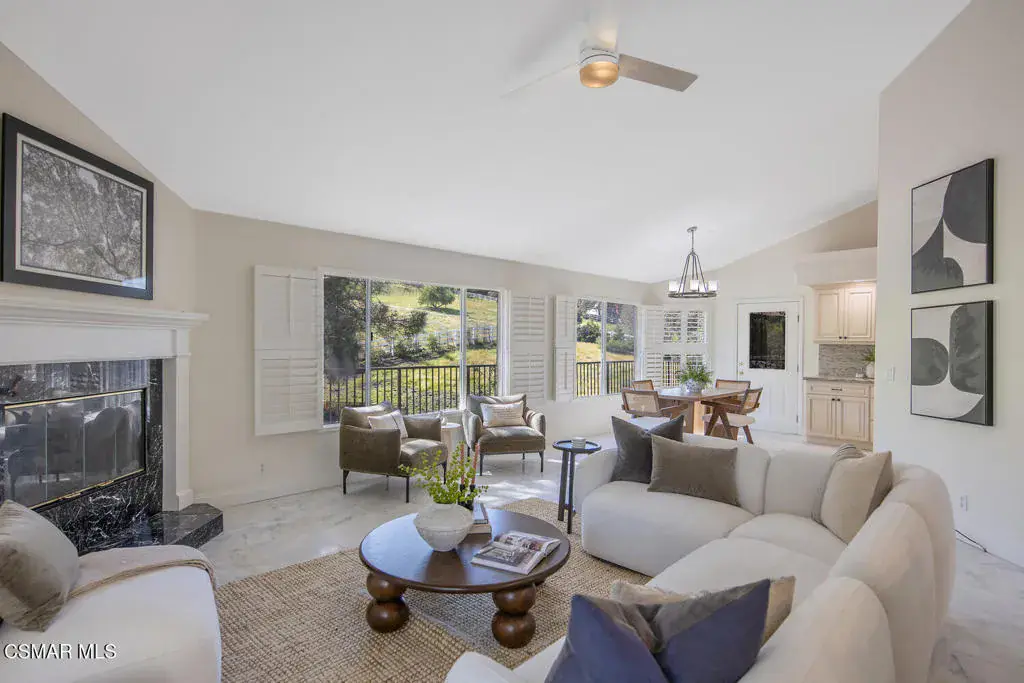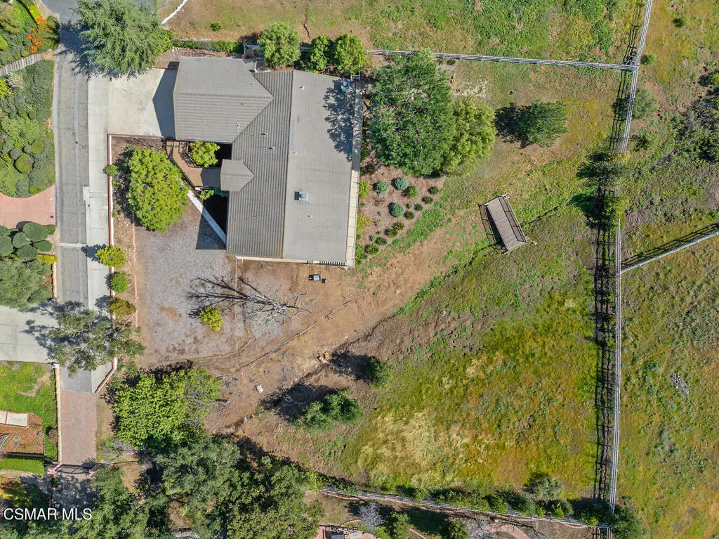 This ONE-STORY custom estate has VIEWS so spectacular they look like a painting. Sitting on a ONE ACRE lot with stunning pastoral and mountain views from almost every room, this one-of-a-kind home is beautiful, unique and private. Enter the spacious living room with soaring vaulted ceilings, a cozy fireplace, and a wall of windows looking right out onto those panoramic views. Enjoy your coffee in the morning or a glass of wine at sunset out on the wrap-around deck while you take in the views of the pastures, mature trees, lush landscaping, and even a charming bridge and a creek that runs through the backyard. This yard is so large there is room for up to two horses, a barn, a large pool, and/or an ADU. Plus, below the one-story home there is a HUGE 500 sq ft BONUS ROOM with a separate entrance. This bonus space has endless possibilities such as a guest room, office, art or music studio, or an ADU (granny flat). As an additional bonus, under the home there is also a huge additional enclosed storage area, and plenty of room for additions.The main home features beautiful real Carrara marble floors throughout, new designer lighting, and plantation shutters. Enjoy cooking in the large gourmet kitchen with a huge island, tons of cabinets, and granite countertops that are gorgeous and still contemporary. The kitchen opens to the sizeable great room with a fireplace, eating area, groovy bar for entertaining, and a door out to the patio looking out to the most beautiful scenes. The primary bedroom is a peaceful retreat complete with high ceilings, spectacular views, his and herswalk-in closets, and a large en-suite bathroom with dual vanities, stall shower, and a soaking tub. Generously sized secondary bedrooms are complemented by two additional bathrooms, offering comfort and flexibility for family and guestsalike. The brand-new wraparound deck/porch provides the perfect setting to take in the spectacular scenery of the surrounding mountains and evening lights, while an outdoor pergola with electricity creates an ideal space for relaxing, or hosting. This home also has a HUGE storage space underneath the home, and a new security system. With its unparalleled views, usable acreage, and seamless indoor-outdoor flow, this one-of-a-kind property delivers privacy, beauty, and exceptional versatility in a truly unforgettable setting.