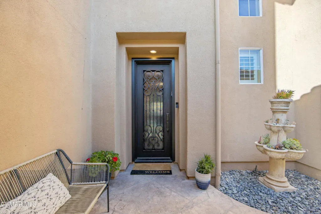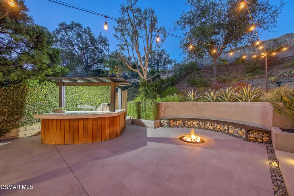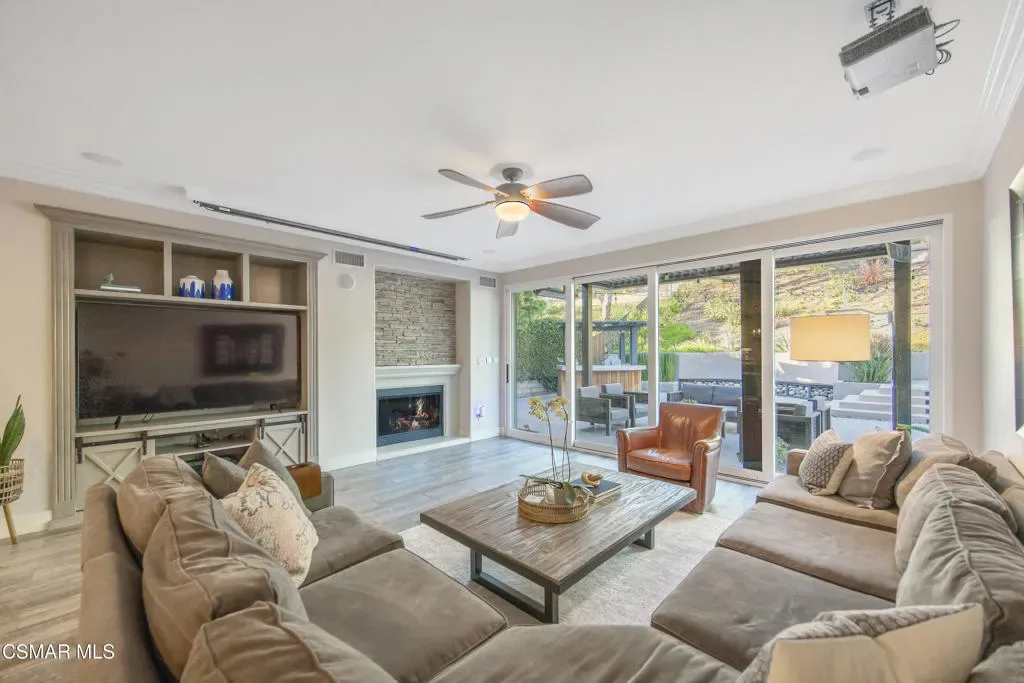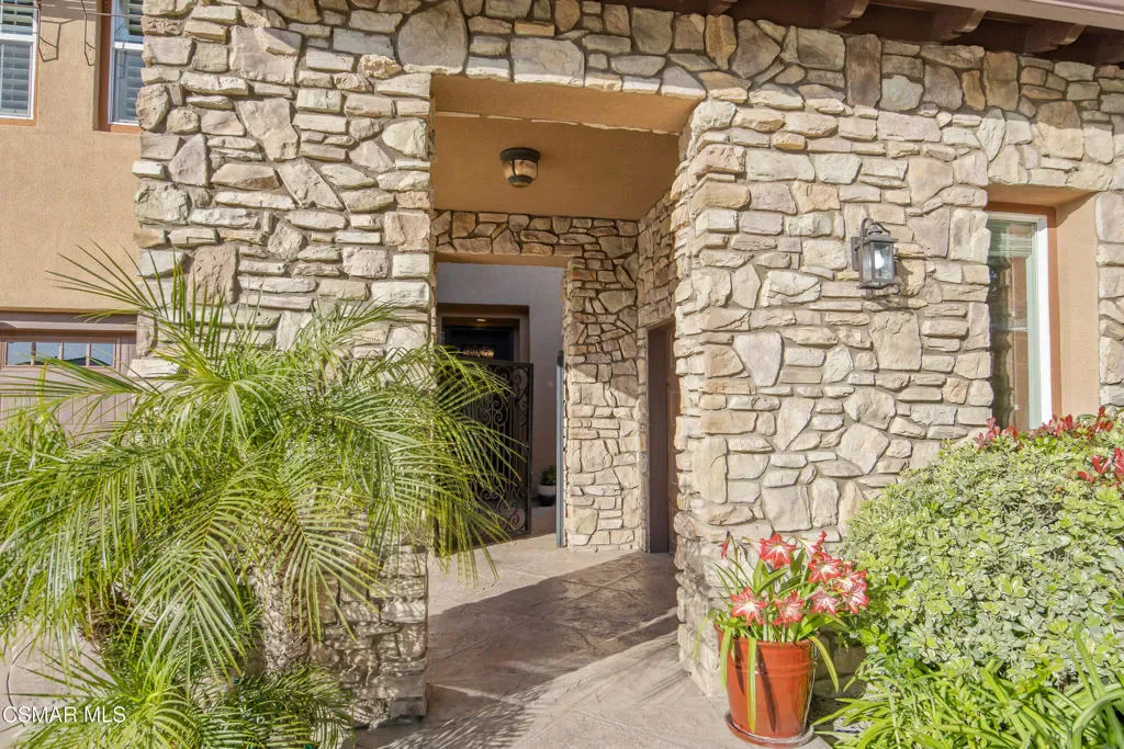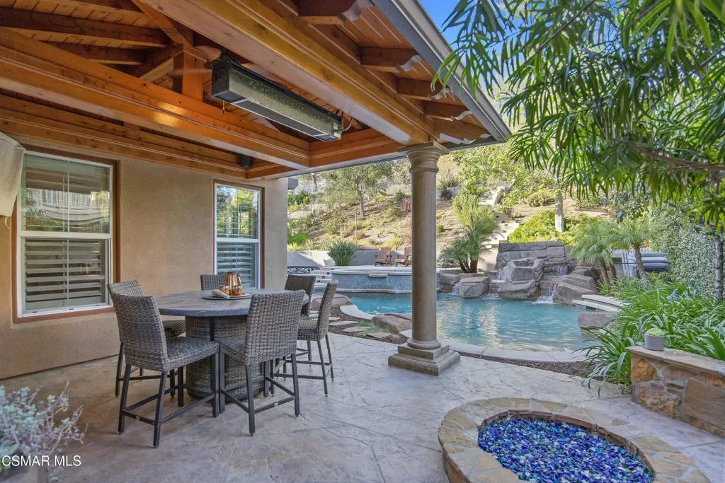 Nestled within the coveted Dos Vientos, this residence captures the essence of Retreat Living–where scenic surroundings, refined interiors, and exceptional outdoor amenities come together in perfect harmony. Curb The sophisticated tone is set instantly with a custom steel front door and gate. The masterfully designed color palette with warm and cool tones creates elevated style and comfort. The design-forward remodeled kitchen featuring an expansive center island, premium KitchenAid Cafe Collection appliances, breakfast area, ample cabinets, granite counters and unique stone and metal backsplash behind the range. The adjoining family room is a true showpiece, complete with a custom entertainment center, fireplace, movie projector, and screen–creating a cinematic experience from the comfort of home. A dramatic 16-foot patio slider invites seamless indoor-outdoor flow, filling the space with natural light. Step outside into the renovated backyard showcasing pool and spa with a dramatic waterfall fire feature, two fire pits, and multiple outdoor living areas. The custom BBQ island with granite countertops and wood trim siding anchors the space, while Italian pavers and river rock accents create a refined landscape aesthetic. A staircase leads to a scenic viewing deck–perfect for enjoying sunsets and mountain views unique to Dos Vientos. Additional highlights include a remote-controlled patio cover with heaters, a second covered lounge area with TV, and snake fencing for added peace of mind. The downstairs continues with a formal dining room with built-ins, a living room set up as a game room with fireplace, pool table, and French doors leading to one of the covered outdoor areas. Upstairs, the luxurious primary retreat offers a private lounge area, spacious walk-in closet, and spa-inspired bathroom designed for relaxation and rejuvenation. An added loft/flex space provides versatility for a gaming room or additional living area. The remaining upstairs bedrooms offer natural light and comfort with generous closets and individual bathroom entrances. The upstairs laundry room with sink and extra storage also enhances everyday convenience.The garage spaces are equally impressive, featuring tiled flooring in the two-car garage, epoxy flooring in the single-car garage, built-in storage, and EV charger readiness. Modern efficiency meets sustainability with leased SunRun solar for the home, owned solar for the pool, Ring security cameras, a manual generator system, and an HVAC system replaced approximately six years ago with smart thermostats. Additional features include main level appointed new tile flooring, newer carpet throughout, wood shutters, fresh interior paint, and a downstairs full bedroom and bathroom–ideal for guests or multigenerational living. Located near miles of hiking and biking trails, award-winning schools, and the natural beauty of Santa Monica Mountains National Recreation Area, this property offers the opportunity to experience the Retreat Lifestyle in Dos Vientos.