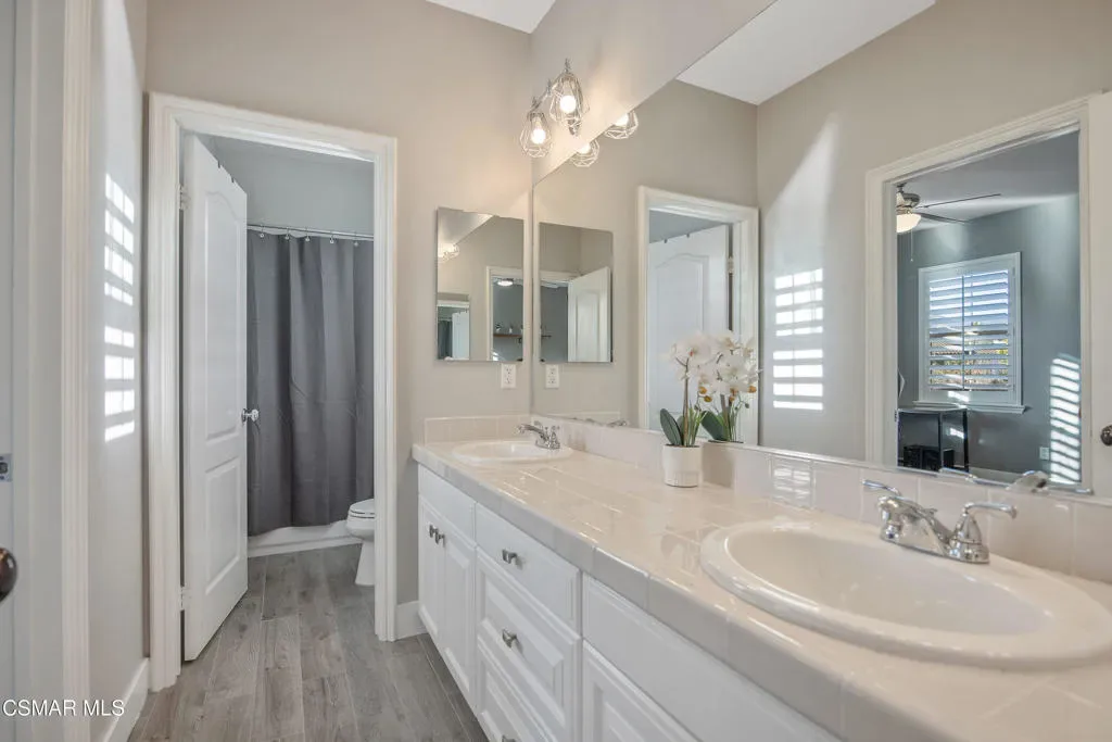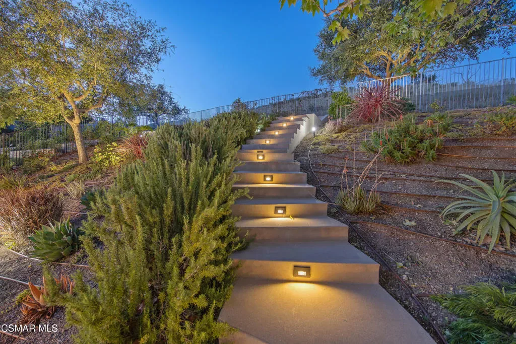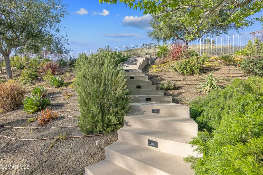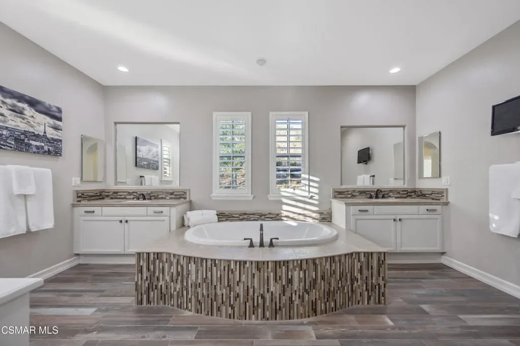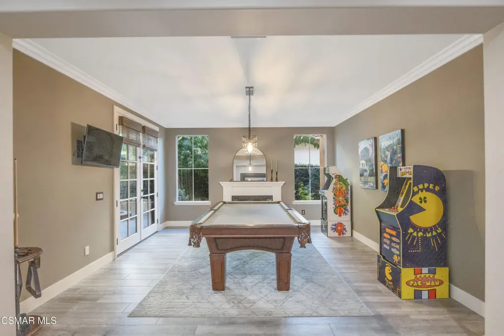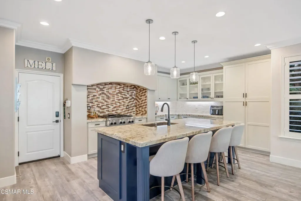 Nestled within the coveted Dos Vientos, this residence captures the essence of Retreat Living–where scenic surroundings, refined interiors, and exceptional outdoor amenities come together in perfect harmony. Curb The sophisticated tone is set instantly with a custom steel front door and gate. The masterfully designed color palette with warm and cool tones creates elevated style and comfort. The design-forward remodeled kitchen featuring an expansive center island, premium KitchenAid Cafe Collection appliances, breakfast area, ample cabinets, granite counters and unique stone and metal backsplash behind the range. The adjoining family room is a true showpiece, complete with a custom entertainment center, fireplace, movie projector, and screen–creating a cinematic experience from the comfort of home. A dramatic 16-foot patio slider invites seamless indoor-outdoor flow, filling the space with natural light. Step outside into the renovated backyard showcasing pool and spa with a dramatic waterfall fire feature, two fire pits, and multiple outdoor living areas. The custom BBQ island with granite countertops and wood trim siding anchors the space, while Italian pavers and river rock accents create a refined landscape aesthetic. A staircase leads to a scenic viewing deck–perfect for enjoying sunsets and mountain views unique to Dos Vientos. Additional highlights include a remote-controlled patio cover with heaters, a second covered lounge area with TV, and snake fencing for added peace of mind. The downstairs continues with a formal dining room with built-ins, a living room set up as a game room with fireplace, pool table, and French doors leading to one of the covered outdoor areas. Upstairs, the luxurious primary retreat offers a private lounge area, spacious walk-in closet, and spa-inspired bathroom designed for relaxation and rejuvenation. An added loft/flex space provides versatility for a gaming room or additional living area. The remaining upstairs bedrooms offer natural light and comfort with generous closets and individual bathroom entrances. The upstairs laundry room with sink and extra storage also enhances everyday convenience.The garage spaces are equally impressive, featuring tiled flooring in the two-car garage, epoxy flooring in the single-car garage, built-in storage, and EV charger readiness. Modern efficiency meets sustainability with leased SunRun solar for the home, owned solar for the pool, Ring security cameras, a manual generator system, and an HVAC system replaced approximately six years ago with smart thermostats. Additional features include main level appointed new tile flooring, newer carpet throughout, wood shutters, fresh interior paint, and a downstairs full bedroom and bathroom–ideal for guests or multigenerational living. Located near miles of hiking and biking trails, award-winning schools, and the natural beauty of Santa Monica Mountains National Recreation Area, this property offers the opportunity to experience the Retreat Lifestyle in Dos Vientos.