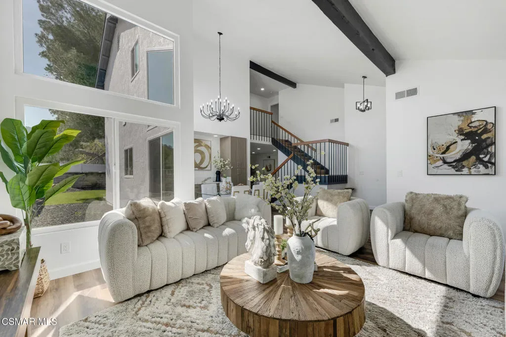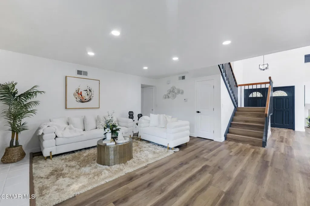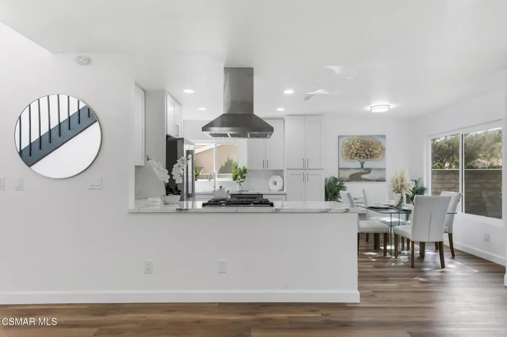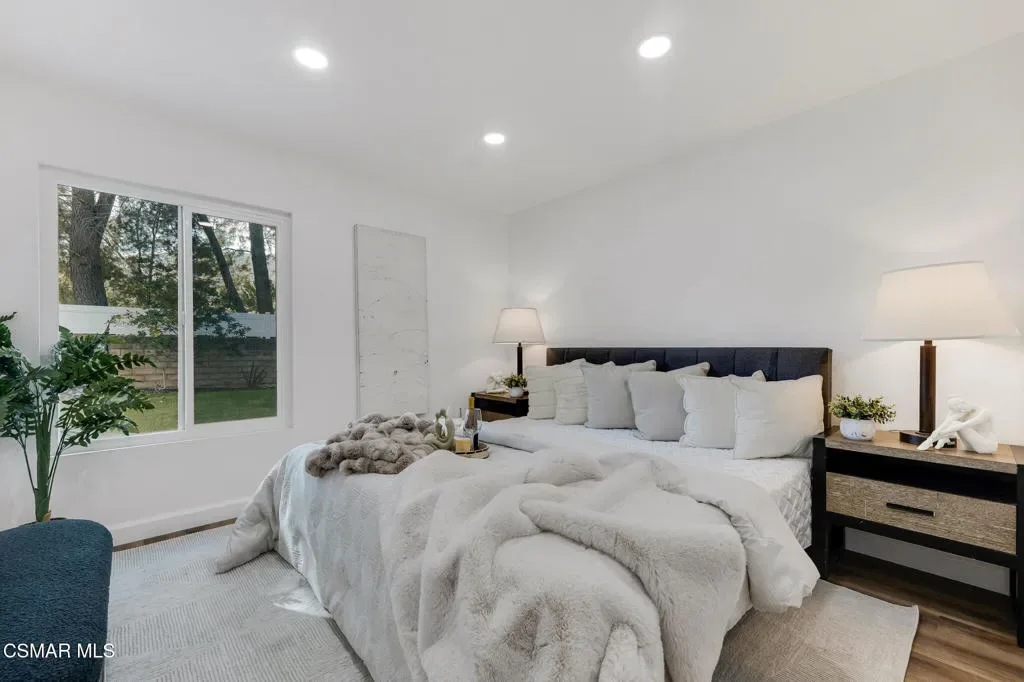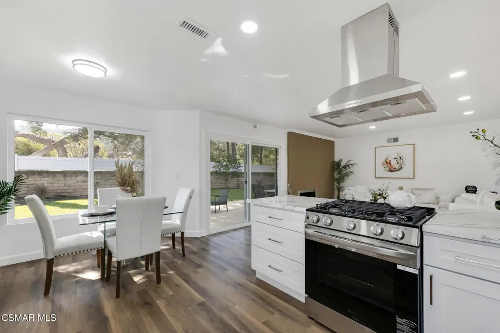 Gorgeously remodeled and brimming with natural light, this stunning two-story home on Pamela Wood in Newbury Park delivers the perfect blend of modern sophistication and comfortable family living. Set within a welcoming, family-friendly neighborhood, the home immediately captivates with a beautifully updated modern exterior, fresh landscaping, and a charming olive tree anchoring the front yard. Step inside to discover a thoughtfully designed floor plan where a formal living room and dining area are bathed in abundant sunlight streaming through large picture windows, creating an inviting atmosphere from the moment you arrive. The completely remodeled kitchen is a true showpiece, featuring sleek new cabinetry, elegant countertops, a gas cooktop, new stainless steel appliances, and a generous peninsula that flows seamlessly into the open family room — ideal for everyday living and effortless entertaining. Adding exceptional versatility, the main level offers a generously sized bedroom and full bathroom, perfectly suited for multi-generational living or anyone who prefers single-story convenience. Upstairs, three spacious bedrooms provide ample room for the entire family, complemented by a fully renovated hall bathroom. The primary suite is a true retreat, boasting impressive proportions, a beautifully renovated en-suite with a dual vanity and custom shower. Thoughtful upgrades abound throughout the home, including brand new matching flooring, new windows, and new LED recessed lighting in every room. Step outside to a private backyard retreat, framed by mature trees and finished with easy-care modern landscaping — a serene space to relax and unwind. Perfectly situated just minutes from The Oaks Mall, premier shopping, and an array of dining options, this move-in ready home offers an unparalleled combination of style, comfort, and convenience. A truly exceptional opportunity in one of Newbury Park’s most desirable neighborhoods!