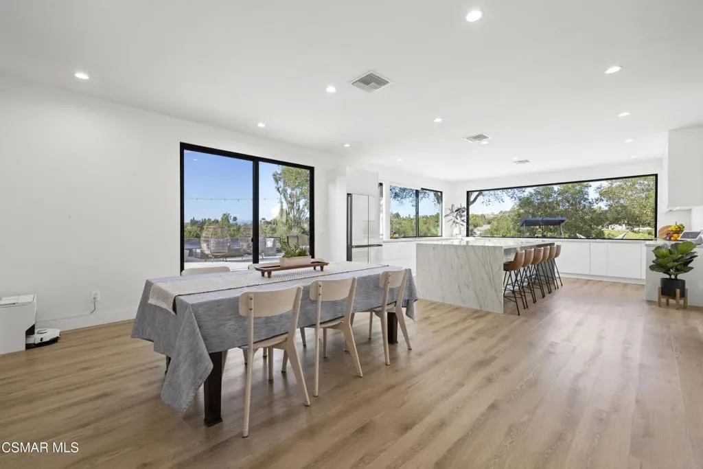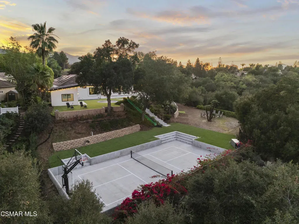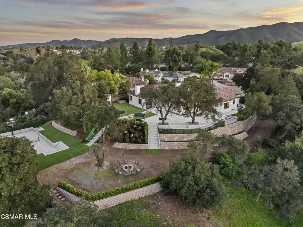 VIEWS! PRIVACY! CONVENIENCE! Privately set at the end of a quiet cul-de-sac in the heart of Thousand Oaks, this fully reimagined single-story estate spans over 4,000 square feet on an extraordinary one-acre lot with unobstructed panoramic mountain views. Surrounded by protected open space and just minutes from the 101 and The Oaks Mall, the home offers a rare blend of serenity, accessibility, and resort-style living.A long, private approach opens to expansive grounds designed for both elevated entertaining and everyday enjoyment. The property unfolds like a private compound, with sweeping vistas, mature landscaping, and direct access to the trails of Rancho Conejo Nature Preserve. The largely flat, usable acreage includes over 9,000 square feet of additional open land and is zoned for horses, offering flexibility for future customization. The plumbing, electrical, and gas lines are already in place for a potential resort-caliber pool.The outdoor experience is unmatched. A lighted pickleball court anchors the grounds, while a custom treehouse complete with rope swing and cargo net, a dramatic 30-foot hillside slide, two fire pits, and multiple gathering spaces create a setting that feels both playful and refined. Over 6,000 square feet of maintenance-free artificial turf blend seamlessly with more than a dozen mature oak and palm trees. Smart home-enabled lighting and water features elevate the landscape into a true evening showpiece. A detached office provides a quiet, separate workspace tucked away from the main residence.Inside, soaring 10-foot ceilings, oversized windows, and walls of glass flood the interiors with natural light and frame the surrounding mountains. The open floor plan is thoughtfully designed for effortless indoor-outdoor flow, creating a bright and expansive atmosphere throughout. Two distinct living areas offer flexibility for both formal and casual gatherings, each anchored by its own fireplace.The chef’s kitchen serves as the centerpiece of the home, showcasing an oversized natural stone island, large picture windows overlooking the backyard and preserve, and a generous walk-in pantry complete with a secondary refrigerator and prep sink. The design balances scale with warmth, making it equally suited for intimate dinners or large-scale entertaining.The primary suite is a private retreat, featuring its own fireplace, direct patio access, and a spa-inspired en suite bath with a freestanding soaking tub, dual shower heads, a spacious walk-in closet, and a floating double-sink vanity. Additional features include dual air conditioning systems, automated blinds, and a recently installed tankless water heater.This is a rare offering that captures the very best of Thousand Oaks living–panoramic views, total privacy, usable acreage, and a thoughtfully remodeled single-story residence designed for seamless indoor-outdoor luxury.