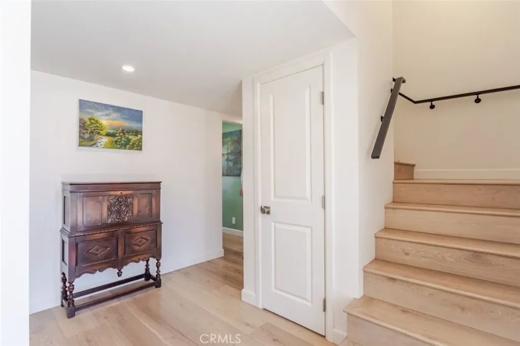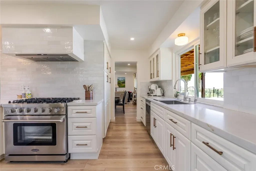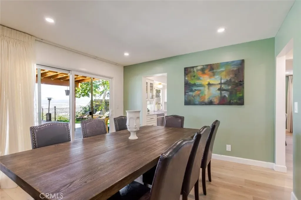 The kitchen is designed for both function and style, featuring white countertops, stainless steel appliances, abundant cabinet storage, and a dedicated dining area perfect for everyday meals or entertaining. Light wood flooring flows throughout the home, enhancing the open and contemporary feel.