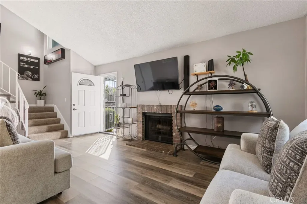 Step inside to a bright and airy living room with soaring vaulted ceilings, stylish wood-style flooring, and a cozy brick fireplace that creates a warm and inviting atmosphere. The open living and dining areas flow seamlessly into the kitchen, offering generous cabinetry and ample counter space, perfect for both casual meals and gatherings with family and friends.