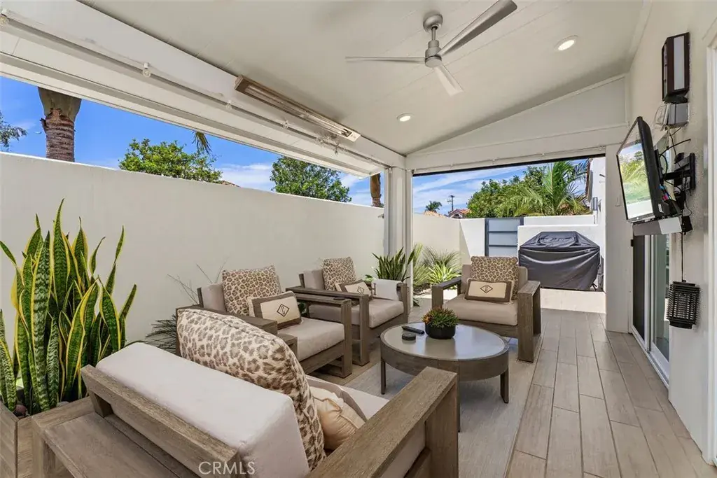 Additional highlights include hidden under-stair storage, internet readiness, newer water heater, custom landscaping, and unmatched curb appeal. Outdoor living is enhanced with porcelain hardscaping that matches the interior, an outdoor TV, and a private setting. The two-car garage is complete with epoxy floors, cabinets, and a new garage door opener.