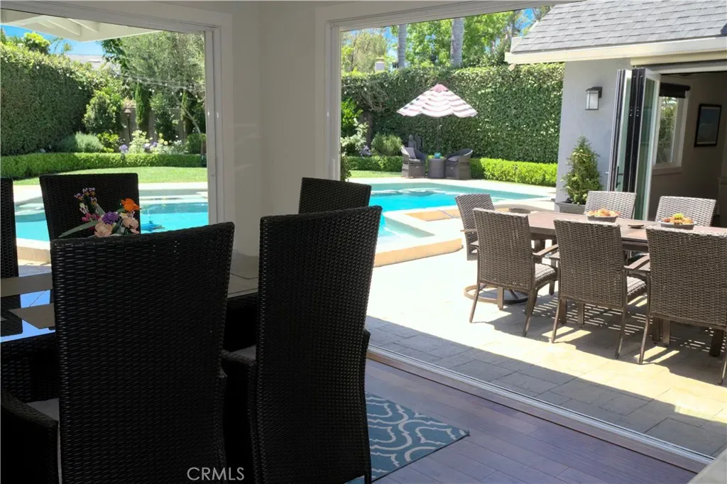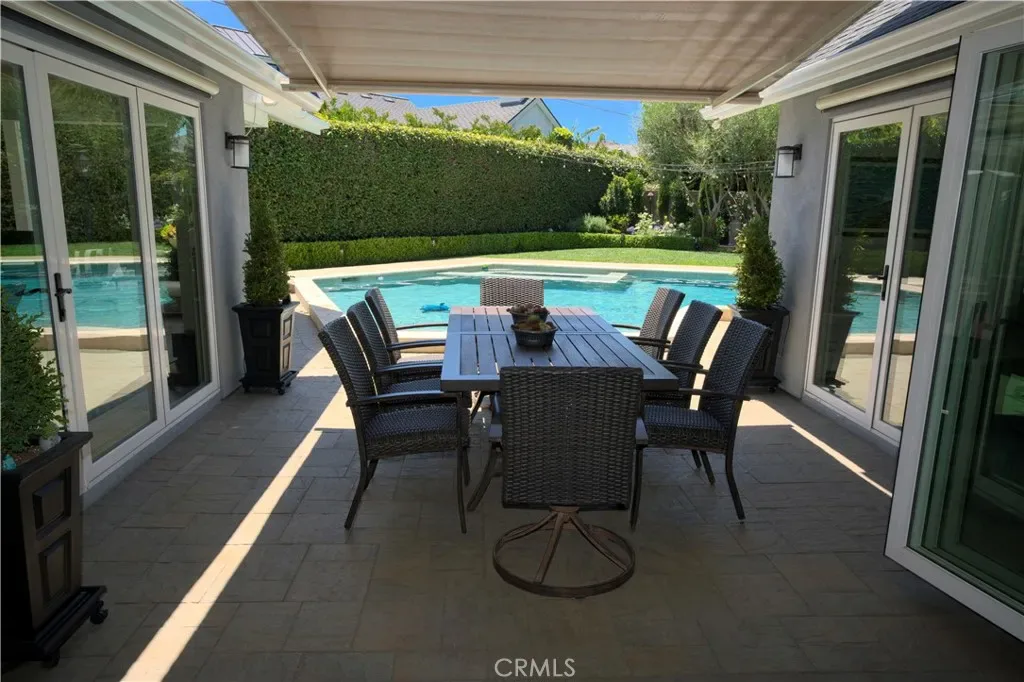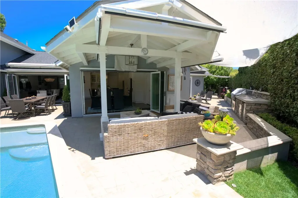 The true selling point is the back of the home that opens seamlessly providing an indoor-outdoor living experience, perfect for quiet afternoons and gatherings with friends. The impressive pool-spa features Travertine Coping and Glass Tile, with a large baja shelf for the little ones to splash and play in a safe setting; the spa seats 10 and the pool is great for laps training. The perimeter of the pool includes easily removable screen panels and two separate gates providing easy access and additional safety.