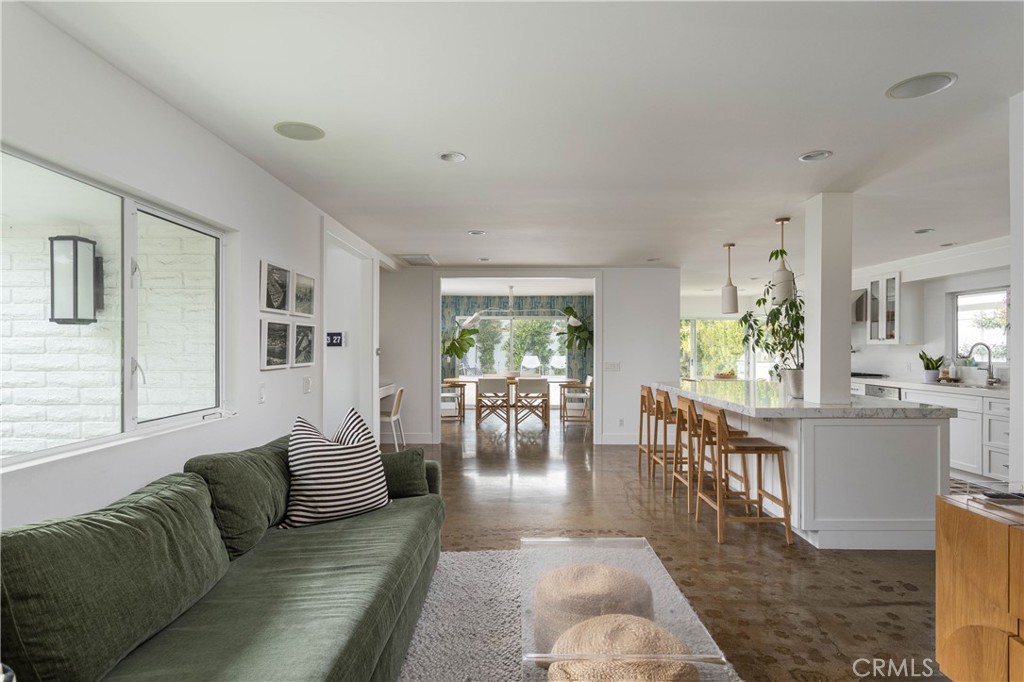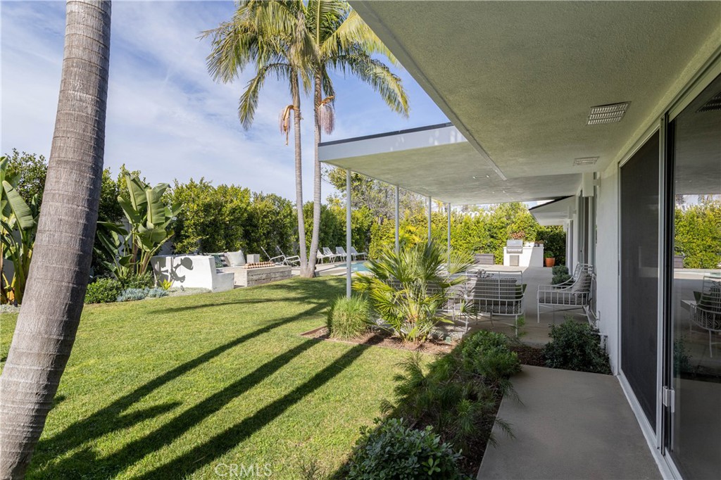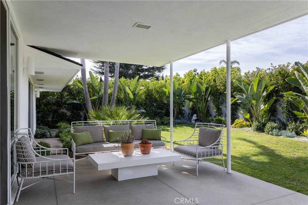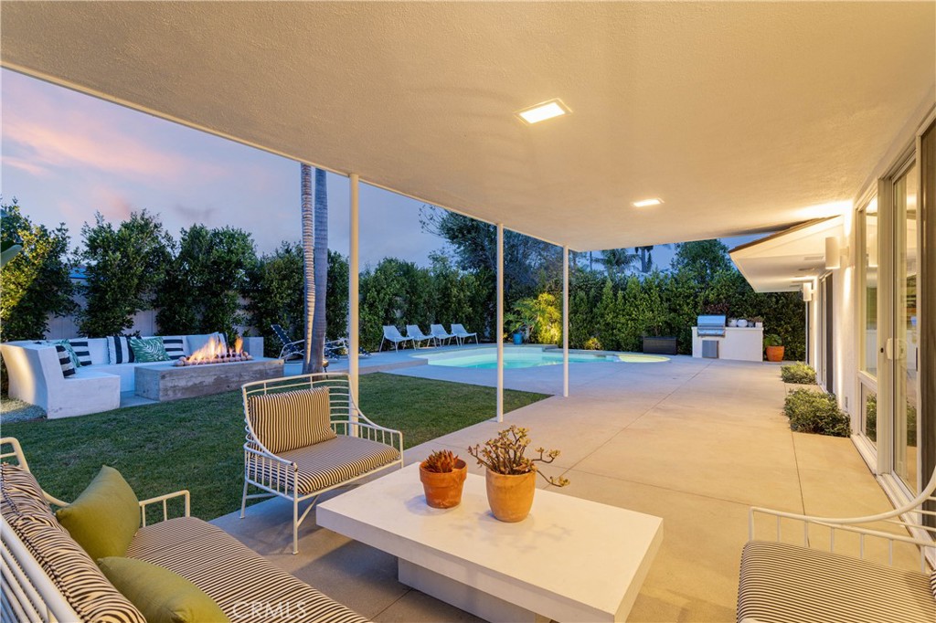 Sited on a nearly eleven thousand square foot parcel on one of the most desirable streets in the Dover Shores area, this fully updated mid-century modern home is a departure from the ordinary. Offering unparalleled privacy by way of a private gated courtyard with mature lemon trees, the double glass entry doors offer a line of site through the home and into large rear yard space. An ample, open concept living area offers two separate living spaces, including one with an oversized gas fireplace and wall to wall polished concrete flooring. The kitchen features floor to ceiling under-lit cabinetry, high end appliances, and a spacious island with seating. A row of large sliding glass doors open from the kitchen, living room, and dining out to the back yard which offers a pool & spa, a large grassy area, mature trees, a poured in place concrete fire pit and built-in barbecue. The bedroom wing of the home can be separated by lockable double doors and offers three ample bedrooms with narrow-plank bleached oak flooring and two and a half bathrooms. This well curated home offers ample natural light, unmatched privacy and a relaxed Palm Springs inspired design which makes every day feel like vacation.