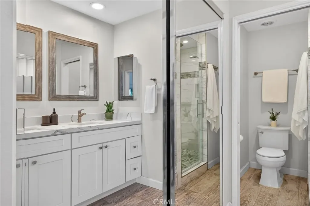 This beautifully renovated 2-bedroom, 2.5-bathroom condo is a true treasure. The main level offers an open-concept design, complete with a cozy fireplace and a stunning kitchen featuring Quartz countertops, white shaker cabinets, Samsung appliances, and a charming private patio. Upstairs, both bedrooms come with their own ensuite bathrooms, adorned with high-end designer finishes. The resort-style primary bathroom offers dual sinks and two showerheads for the ultimate spa-like experience. Luxury vinyl plank flooring flows throughout the home, complemented by the convenience of an in-unit laundry with a washer and dryer included. The property also includes a two-car detached garage with extra storage, located directly behind the home. Perfectly situated near the 17th Street corridor, this location offers unparalleled convenience and charm!