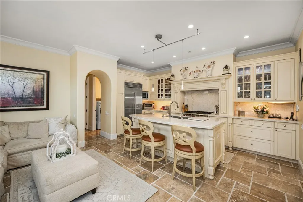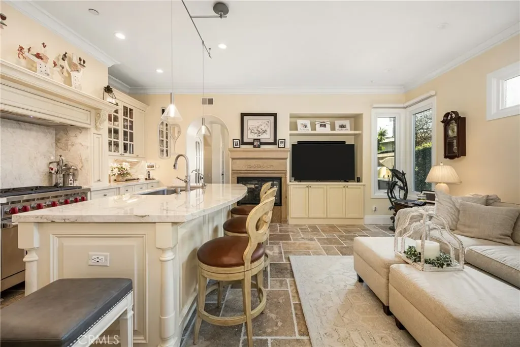 Located in sought-after Newport Heights, this luxurious Tuscan-style townhome offers an exceptional blend of elegance, warmth, and upscale coastal living. From the gated garden entry to the beautiful Mediterranean exterior, the home makes an immediate impression with timeless architectural character and manicured surroundings. Inside, a spacious floor plan unfolds with stone flooring, arched openings, recessed lighting, crown molding, and a stunning wrought iron staircase that anchors the interior with dramatic style. The formal living area features a beautiful stone fireplace, custom niches, and abundant natural light, flowing seamlessly into the dining space and gourmet kitchen. Designed for both entertaining and everyday living, the kitchen showcases expansive stone counters, custom cabinetry, glass display uppers, a large center island with bar seating, pendant lighting, and premium stainless steel appliances, including a professional-style range. An adjoining family room provides additional lounge space and comfort. Upstairs, spacious bedrooms and a versatile loft-style area are complemented by a serene primary suite with plantation shutters and a spa-inspired bath featuring a soaking tub, dual vanities, and stone shower. Rich finishes, custom detailing, and thoughtfully designed living spaces carry throughout the home, while the exterior offers classic tile rooflines, lush greenery, and inviting outdoor charm. Just moments from premier shopping, dining, beaches, and freeway access, this Newport Heights residence delivers sophisticated living in one of Newport Beach’s most desirable neighborhoods.