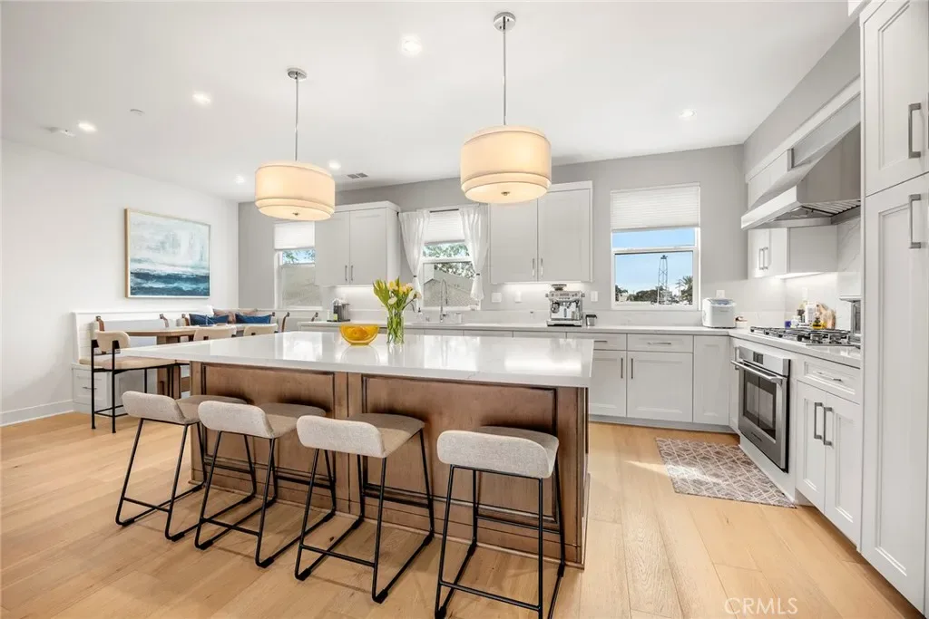The light-filled open floor plan features wide-plank white oak flooring, custom millwork, and designer finishes at every turn. The gourmet kitchen is a chef’s dream, seamlessly connecting to the living and dining areas and highlighted by a charming built-in banquette—perfect for everyday living or effortless entertaining.