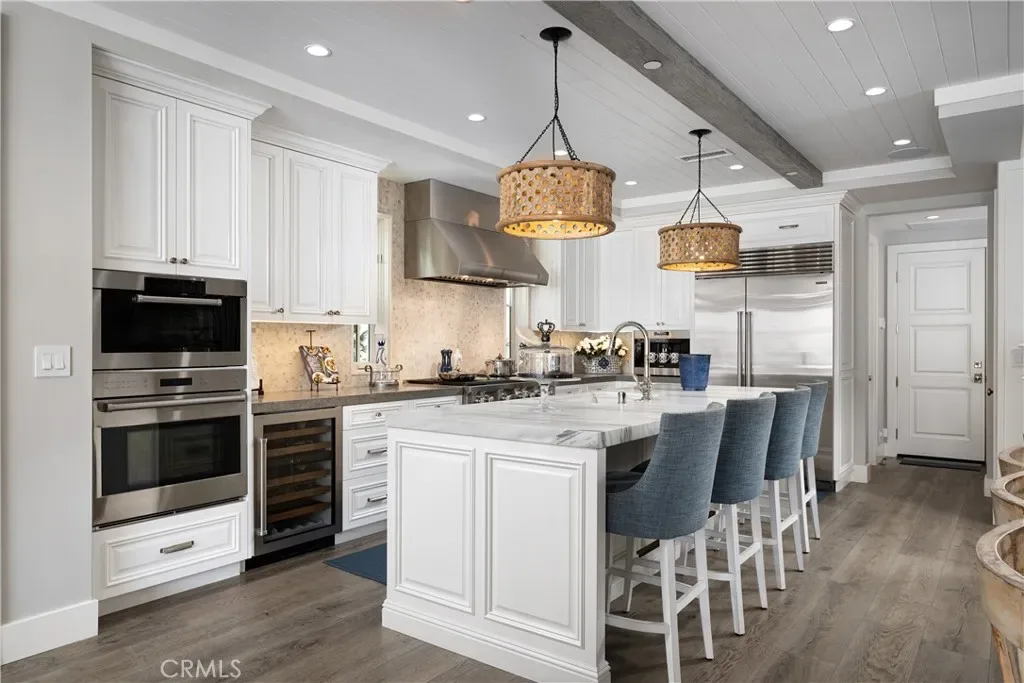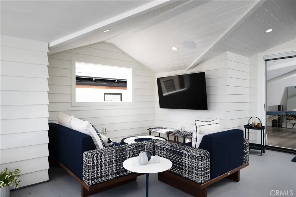 The upper level serves as a true indoor–outdoor retreat, opening to dual rooftop decks with sweeping views of the Pacific Ocean, Catalina Island, city lights, Fashion Island, and Saddleback Mountain. A covered entertaining area with built-in buffet, sink, and enclosed wine refrigerator, plus a private spa, provides an ideal setting for sunset relaxation or comfortably entertaining a large party in luxury.
