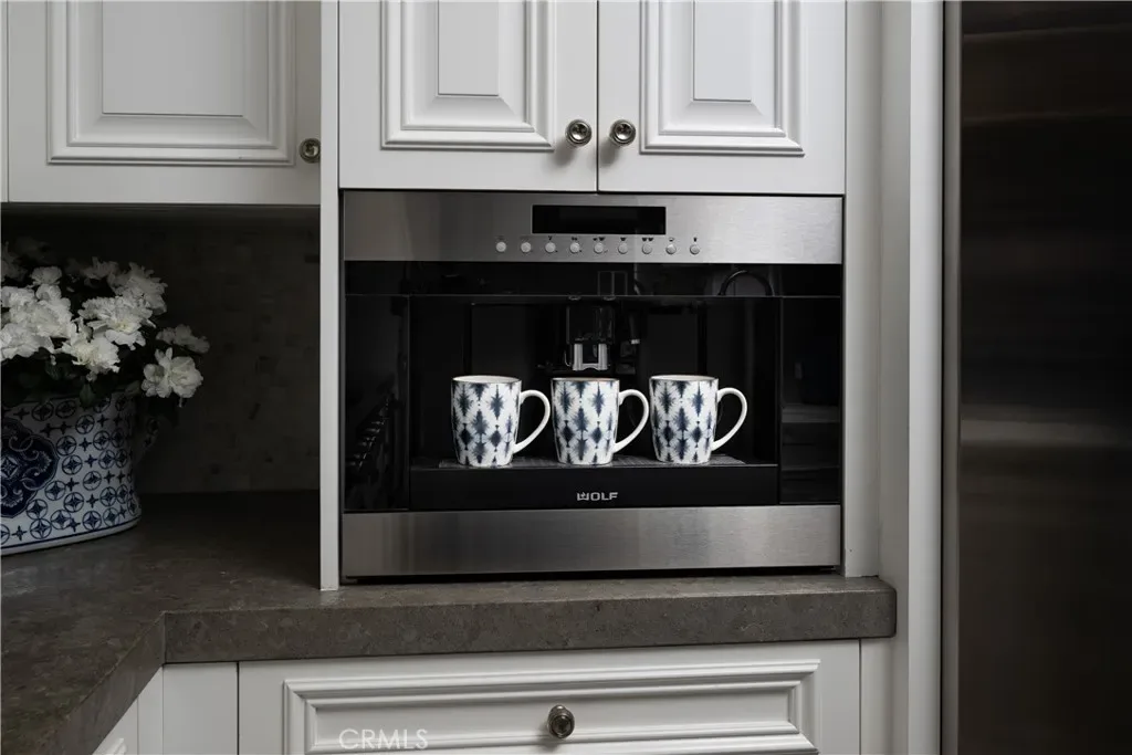The entertainer’s kitchen is both functional and striking, featuring Sub-Zero refrigeration, a 48” Wolf range, double oven with steamer, built-in Wolf espresso machine, integrated wine refrigerator, custom cabinetry, and natural honed stone and Calacatta Borghini marble countertops with a statement mosaic marble backsplash.