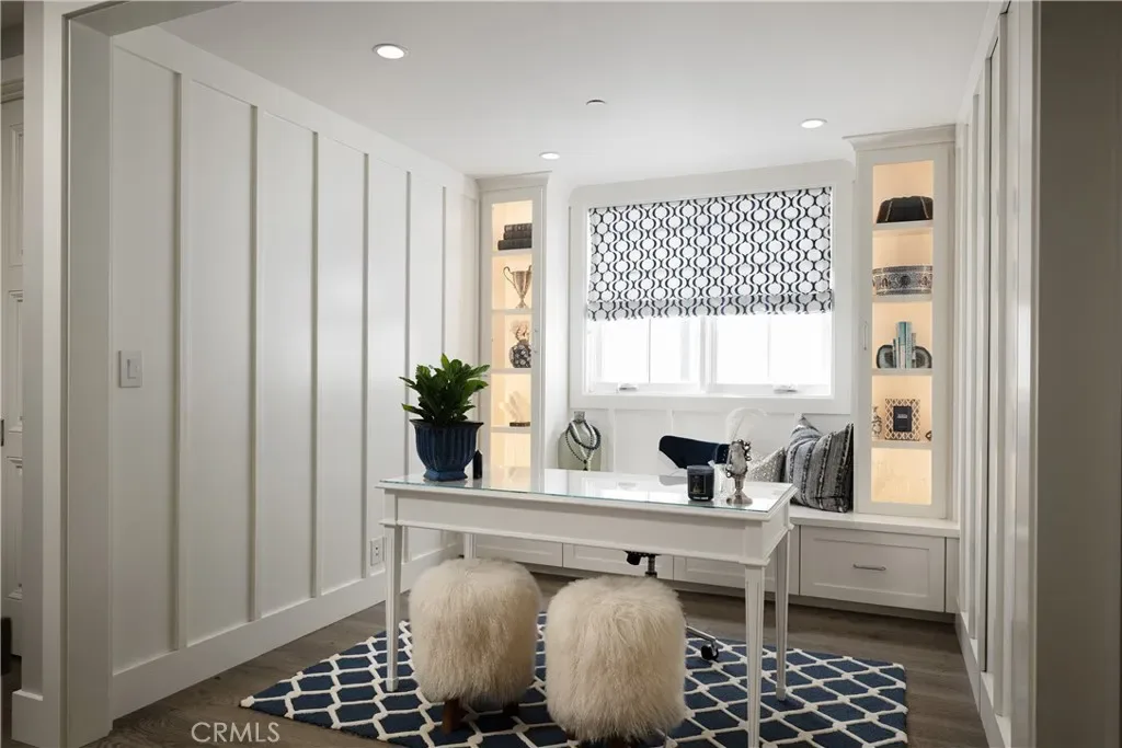 Outdoor living continues with a welcoming front patio, custom fountain, and covered beach shower. Interior highlights include plantation shutters, custom window coverings, a thoughtfully designed office with built-ins and concealed storage, and a beautifully appointed custom closet in the primary suite.