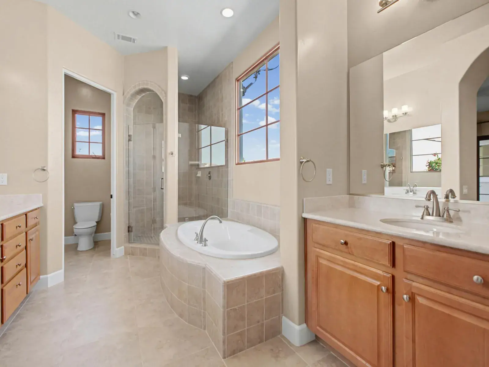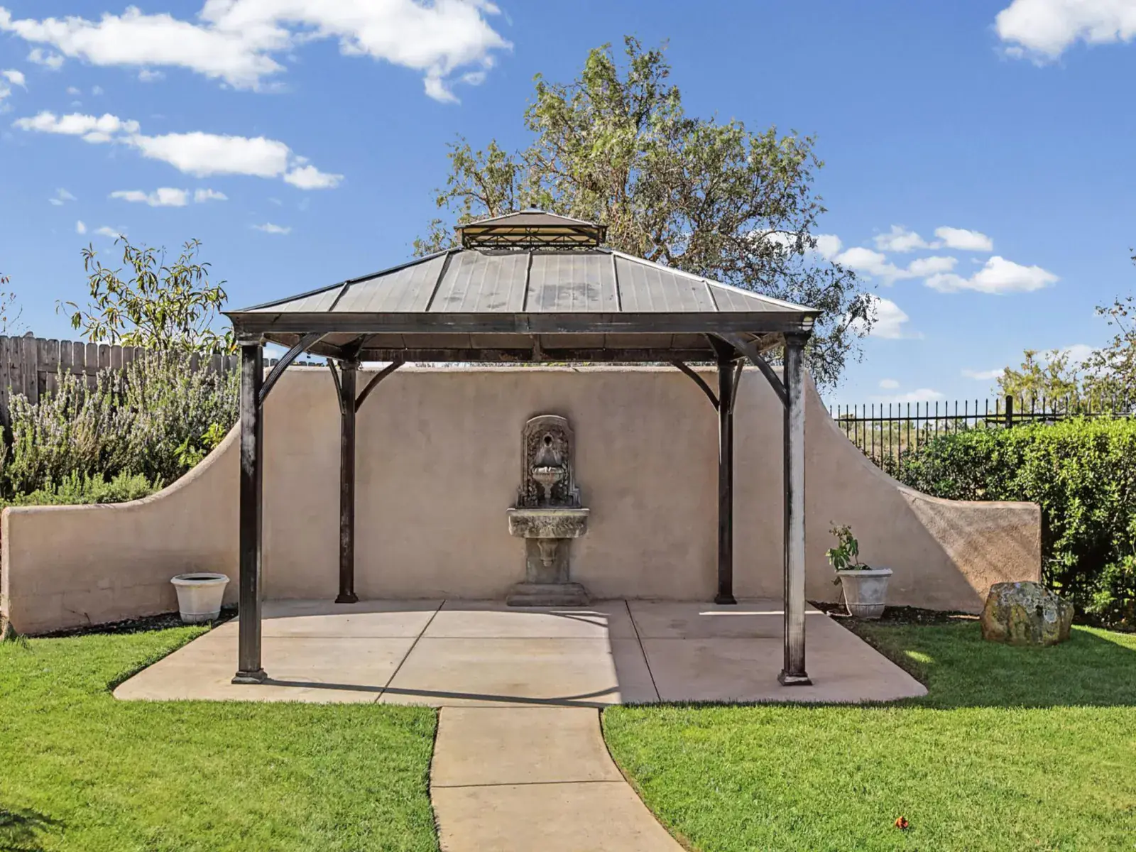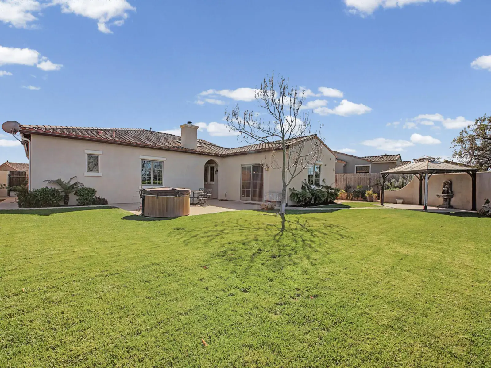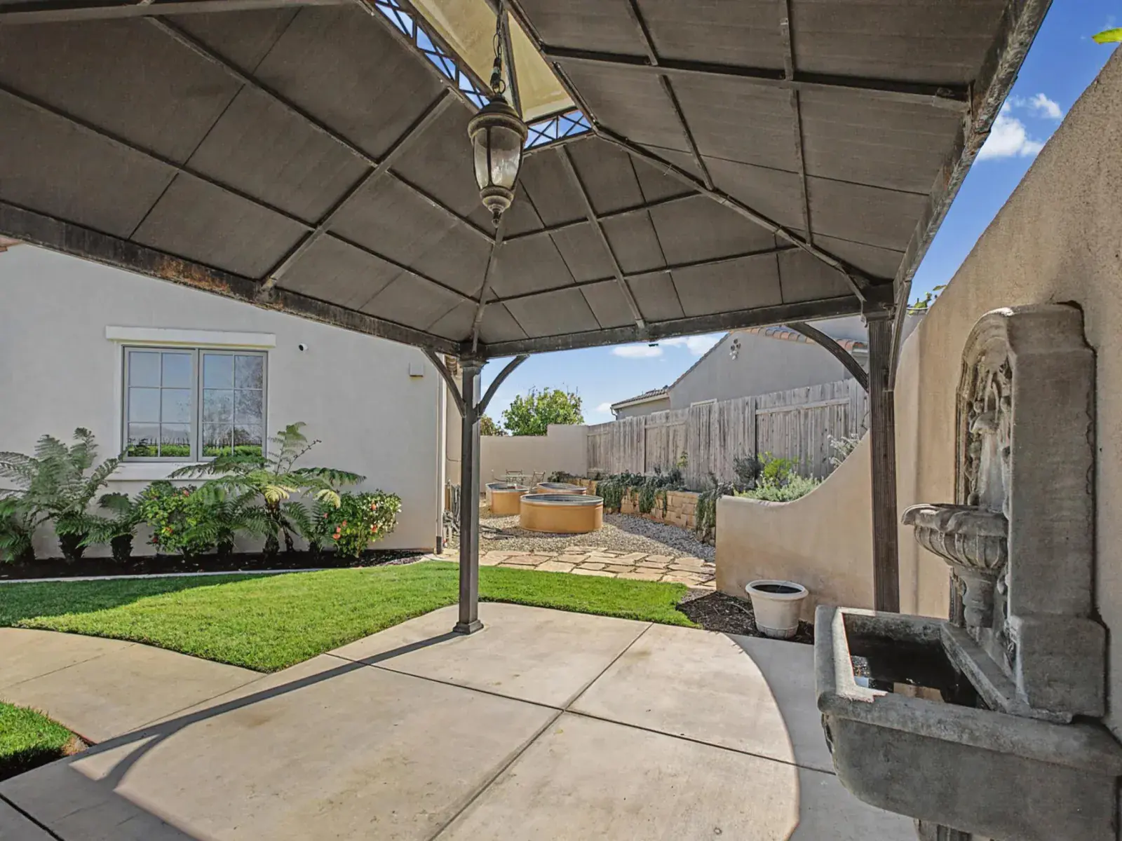 Welcome to this stunning single-story home in the highly desirable Costa Pacifica Estates, tucked away in a quiet cul-del-sac with open land behind for added privacy. Built in 2014, this 2,426 sq ft home sits on a large 12,616 sq ft lot and offers an inviting open floor plan with tall ceilings throughout. The heart of the home features an open kitchen, dining and living area, highlighted by a gas fireplace, perfect for everyday living and entertaining. The kitchen features granite countertops, a large island, breakfast bar, plenty of cabinets and a sliding door leading to the patio. Refrigerator, washer, and dryer are included, adding to the home’s move-in-ready appeal. The spacious primary suite offers a relaxing retreat with two oversized walk-in closets, a soaking tub, walk-in shower and dual sink areas, along with direct access to a covered patio with a gas fireplace. Two additional bedrooms and a full guest bathroom provide comfortable accommodation for family or guests. Step outside to the spacious backyard that is ideal for relaxation and entertaining, featuring multiple patio areas, a cozy covered retreat with a gas fireplace, a lighted gazebo with a soothing waterfall feature, and an above-ground spa. Raised garden beds complete the space. Additional highlights include indoor laundry (washer and dryer included) with sink and cabinetry, two garages (one 2-car and one single-car), and a convent location close to the neighborhood park and shopping. ** Move-in ready and designed for comfort, privacy and entertainment–this home is a must-see!!