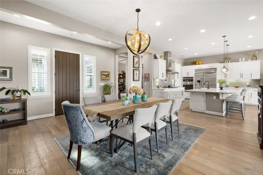 Modern Ranch meets California Coastal in this exquisitely upgraded Ventana floorplan, perfectly positioned to capture sweeping views of the vineyards, the shimmering lake and fountain, and the mountain range that frames the horizon. From sunrise to sunset, the scenery becomes a stunning natural backdrop—ever changing and always captivating. The home’s exceptional curb appeal sets an immediate impression of quality. Fresh exterior paint, stone-accented retaining walls, and a beautifully designed paver courtyard with a tranquil fountain create a welcoming entry that reflects the care and attention invested throughout the property. Inside, the chef’s kitchen features stylish white cabinetry with premium hardware, quartzite slab countertops, a generous island, a built-in refrigerator, and stainless appliances with a sleek range hood. The kitchen opens seamlessly to the great room, where a dramatic floor-to-ceiling stacked-stone fireplace adds warmth and architectural presence. Professionally designed interiors elevate every room. Automatic window treatments, plantation shutters, oak hardwood floors, and wallpaper-accented rooms create a sophisticated aesthetic. The optimized Smart-Space laundry room enhances convenience with custom cabinetry, a sink, and a built-in desk area along with a bay of cabinets in the garage for added storage. The outdoor living experience is a true highlight of this home. The covered patio functions as an additional living room, offering year-round comfort with a drop-down shade and generous space for dining or lounging. Beyond, paver pathways lead to a peaceful sitting area with built-in firepit overlooking the lake and fountain—an ideal vantage point to enjoy the reflection of the sun on the water and the dramatic silhouette of the mountains as the sky shifts throughout the day.