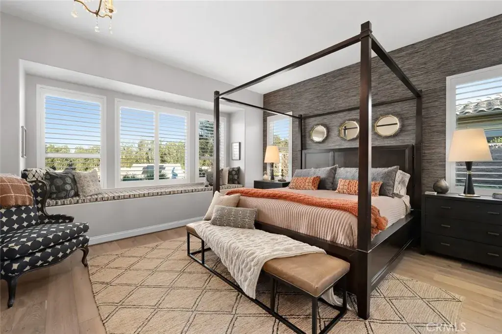 Modern Ranch meets California Coastal in this exquisitely upgraded Ventana floorplan, perfectly positioned to capture sweeping views of the vineyards, the shimmering lake and fountain, and the mountain range that frames the horizon. From sunrise to sunset, the scenery becomes a stunning natural backdrop—ever changing and always captivating. The home’s exceptional curb appeal sets an immediate impression of quality. Fresh exterior paint, stone-accented retaining walls, and a beautifully designed paver courtyard with a tranquil fountain create a welcoming entry that reflects the care and attention invested throughout the property. Inside, the chef’s kitchen features stylish white cabinetry with premium hardware, quartzite slab countertops, a generous island, a built-in refrigerator, and stainless appliances with a sleek range hood. The kitchen opens seamlessly to the great room, where a dramatic floor-to-ceiling stacked-stone fireplace adds warmth and architectural presence. Professionally designed interiors elevate every room. Automatic window treatments, plantation shutters, oak hardwood floors, and wallpaper-accented rooms create a sophisticated aesthetic. The optimized Smart-Space laundry room enhances convenience with custom cabinetry, a sink, and a built-in desk area along with a bay of cabinets in the garage for added storage. The outdoor living experience is a true highlight of this home. The covered patio functions as an additional living room, offering year-round comfort with a drop-down shade and generous space for dining or lounging. Beyond, paver pathways lead to a peaceful sitting area with built-in firepit overlooking the lake and fountain—an ideal vantage point to enjoy the reflection of the sun on the water and the dramatic silhouette of the mountains as the sky shifts throughout the day.
