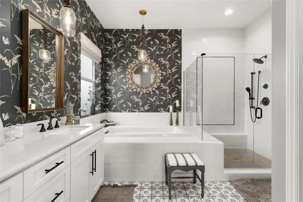 Modern Ranch meets California Coastal in this exquisitely upgraded Ventana floorplan, perfectly positioned to capture sweeping views of the vineyards, the shimmering lake and fountain, and the mountain range that frames the horizon. From sunrise to sunset, the scenery becomes a stunning natural backdrop—ever changing and always captivating. The home’s exceptional curb appeal sets an immediate impression of quality. Fresh exterior paint, stone-accented retaining walls, and a beautifully designed paver courtyard with a tranquil fountain create a welcoming entry that reflects the care and attention invested throughout the property. Inside, the chef’s kitchen features stylish white cabinetry with premium hardware, quartzite slab countertops, a generous island, a built-in refrigerator, and stainless appliances with a sleek range hood. The kitchen opens seamlessly to the great room, where a dramatic floor-to-ceiling stacked-stone fireplace adds warmth and architectural presence. Professionally designed interiors elevate every room. Automatic window treatments, plantation shutters, oak hardwood floors, and wallpaper-accented rooms create a sophisticated aesthetic. The optimized Smart-Space laundry room enhances convenience with custom cabinetry, a sink, and a built-in desk area along with a bay of cabinets in the garage for added storage. The outdoor living experience is a true highlight of this home. The covered patio functions as an additional living room, offering year-round comfort with a drop-down shade and generous space for dining or lounging. Beyond, paver pathways lead to a peaceful sitting area with built-in firepit overlooking the lake and fountain—an ideal vantage point to enjoy the reflection of the sun on the water and the dramatic silhouette of the mountains as the sky shifts throughout the day.