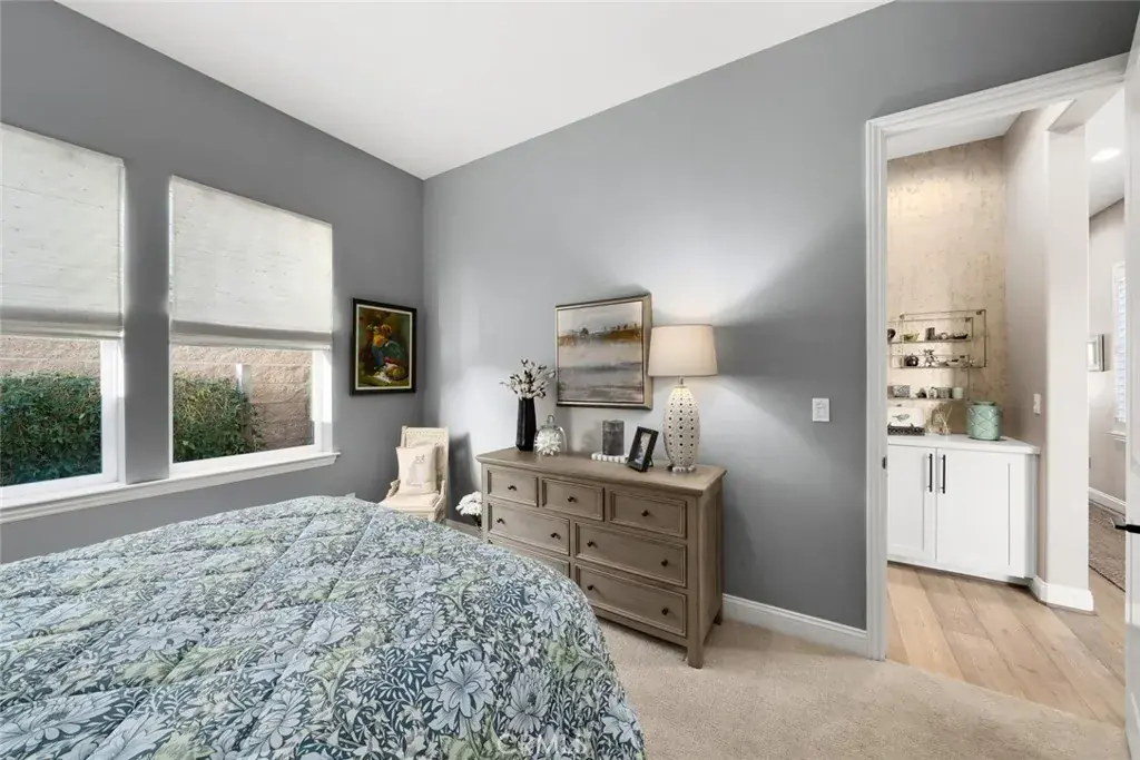 Modern Ranch meets California Coastal in this exquisitely upgraded Ventana floorplan, perfectly positioned to capture sweeping views of the vineyards, the shimmering lake and fountain, and the mountain range that frames the horizon. From sunrise to sunset, the scenery becomes a stunning natural backdrop—ever changing and always captivating. The home’s exceptional curb appeal sets an immediate impression of quality. Fresh exterior paint, stone-accented retaining walls, and a beautifully designed paver courtyard with a tranquil fountain create a welcoming entry that reflects the care and attention invested throughout the property. Inside, the chef’s kitchen features stylish white cabinetry with premium hardware, quartzite slab countertops, a generous island, a built-in refrigerator, and stainless appliances with a sleek range hood. The kitchen opens seamlessly to the great room, where a dramatic floor-to-ceiling stacked-stone fireplace adds warmth and architectural presence. Professionally designed interiors elevate every room. Automatic window treatments, plantation shutters, oak hardwood floors, and wallpaper-accented rooms create a sophisticated aesthetic. The optimized Smart-Space laundry room enhances convenience with custom cabinetry, a sink, and a built-in desk area along with a bay of cabinets in the garage for added storage. The outdoor living experience is a true highlight of this home. The covered patio functions as an additional living room, offering year-round comfort with a drop-down shade and generous space for dining or lounging. Beyond, paver pathways lead to a peaceful sitting area with built-in firepit overlooking the lake and fountain—an ideal vantage point to enjoy the reflection of the sun on the water and the dramatic silhouette of the mountains as the sky shifts throughout the day.