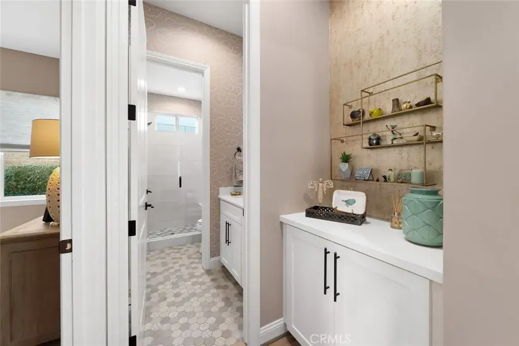 Modern Ranch meets California Coastal in this exquisitely upgraded Ventana floorplan, perfectly positioned to capture sweeping views of the vineyards, the shimmering lake and fountain, and the mountain range that frames the horizon. From sunrise to sunset, the scenery becomes a stunning natural backdrop—ever changing and always captivating. The home’s exceptional curb appeal sets an immediate impression of quality. Fresh exterior paint, stone-accented retaining walls, and a beautifully designed paver courtyard with a tranquil fountain create a welcoming entry that reflects the care and attention invested throughout the property. Inside, the chef’s kitchen features stylish white cabinetry with premium hardware, quartzite slab countertops, a generous island, a built-in refrigerator, and stainless appliances with a sleek range hood. The kitchen opens seamlessly to the great room, where a dramatic floor-to-ceiling stacked-stone fireplace adds warmth and architectural presence. Professionally designed interiors elevate every room. Automatic window treatments, plantation shutters, oak hardwood floors, and wallpaper-accented rooms create a sophisticated aesthetic. The optimized Smart-Space laundry room enhances convenience with custom cabinetry, a sink, and a built-in desk area along with a bay of cabinets in the garage for added storage. The outdoor living experience is a true highlight of this home. The covered patio functions as an additional living room, offering year-round comfort with a drop-down shade and generous space for dining or lounging. Beyond, paver pathways lead to a peaceful sitting area with built-in firepit overlooking the lake and fountain—an ideal vantage point to enjoy the reflection of the sun on the water and the dramatic silhouette of the mountains as the sky shifts throughout the day.