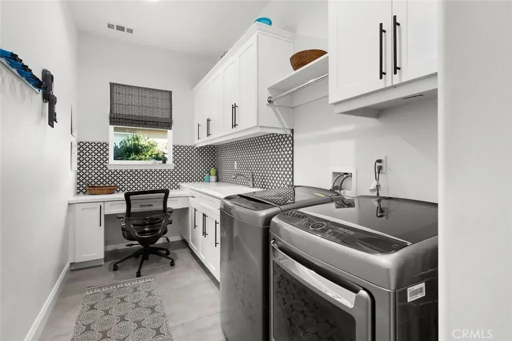 Modern Ranch meets California Coastal in this exquisitely upgraded Ventana floorplan, perfectly positioned to capture sweeping views of the vineyards, the shimmering lake and fountain, and the mountain range that frames the horizon. From sunrise to sunset, the scenery becomes a stunning natural backdrop—ever changing and always captivating. The home’s exceptional curb appeal sets an immediate impression of quality. Fresh exterior paint, stone-accented retaining walls, and a beautifully designed paver courtyard with a tranquil fountain create a welcoming entry that reflects the care and attention invested throughout the property. Inside, the chef’s kitchen features stylish white cabinetry with premium hardware, quartzite slab countertops, a generous island, a built-in refrigerator, and stainless appliances with a sleek range hood. The kitchen opens seamlessly to the great room, where a dramatic floor-to-ceiling stacked-stone fireplace adds warmth and architectural presence. Professionally designed interiors elevate every room. Automatic window treatments, plantation shutters, oak hardwood floors, and wallpaper-accented rooms create a sophisticated aesthetic. The optimized Smart-Space laundry room enhances convenience with custom cabinetry, a sink, and a built-in desk area along with a bay of cabinets in the garage for added storage. The outdoor living experience is a true highlight of this home. The covered patio functions as an additional living room, offering year-round comfort with a drop-down shade and generous space for dining or lounging. Beyond, paver pathways lead to a peaceful sitting area with built-in firepit overlooking the lake and fountain—an ideal vantage point to enjoy the reflection of the sun on the water and the dramatic silhouette of the mountains as the sky shifts throughout the day.