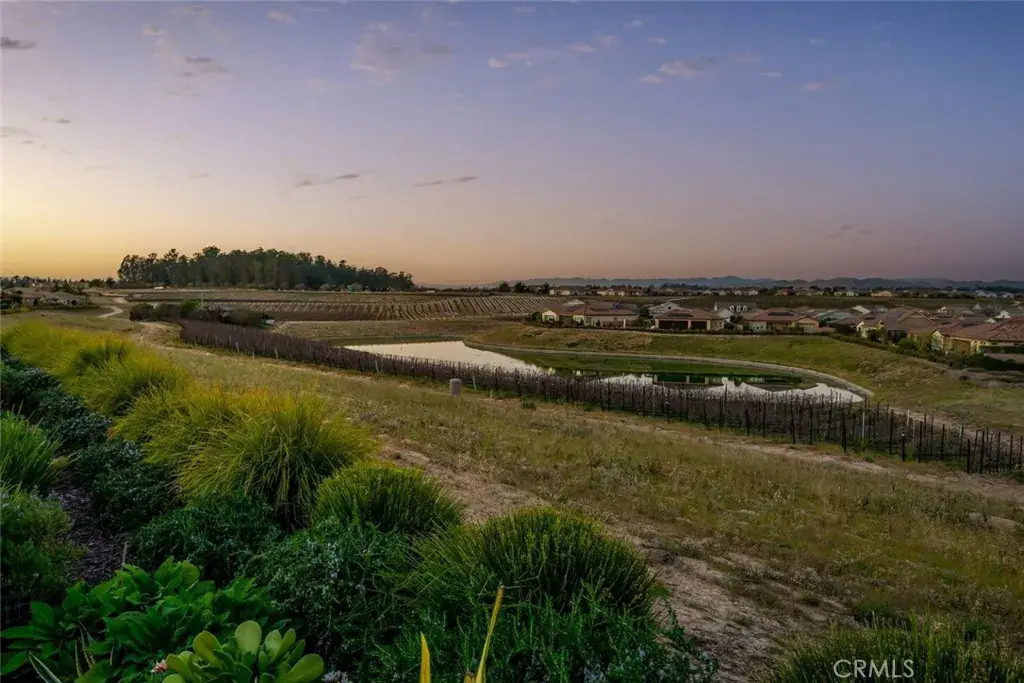 Modern Ranch meets California Coastal in this exquisitely upgraded Ventana floorplan, perfectly positioned to capture sweeping views of the vineyards, the shimmering lake and fountain, and the mountain range that frames the horizon. From sunrise to sunset, the scenery becomes a stunning natural backdrop—ever changing and always captivating. The home’s exceptional curb appeal sets an immediate impression of quality. Fresh exterior paint, stone-accented retaining walls, and a beautifully designed paver courtyard with a tranquil fountain create a welcoming entry that reflects the care and attention invested throughout the property. Inside, the chef’s kitchen features stylish white cabinetry with premium hardware, quartzite slab countertops, a generous island, a built-in refrigerator, and stainless appliances with a sleek range hood. The kitchen opens seamlessly to the great room, where a dramatic floor-to-ceiling stacked-stone fireplace adds warmth and architectural presence. Professionally designed interiors elevate every room. Automatic window treatments, plantation shutters, oak hardwood floors, and wallpaper-accented rooms create a sophisticated aesthetic. The optimized Smart-Space laundry room enhances convenience with custom cabinetry, a sink, and a built-in desk area along with a bay of cabinets in the garage for added storage. The outdoor living experience is a true highlight of this home. The covered patio functions as an additional living room, offering year-round comfort with a drop-down shade and generous space for dining or lounging. Beyond, paver pathways lead to a peaceful sitting area with built-in firepit overlooking the lake and fountain—an ideal vantage point to enjoy the reflection of the sun on the water and the dramatic silhouette of the mountains as the sky shifts throughout the day.