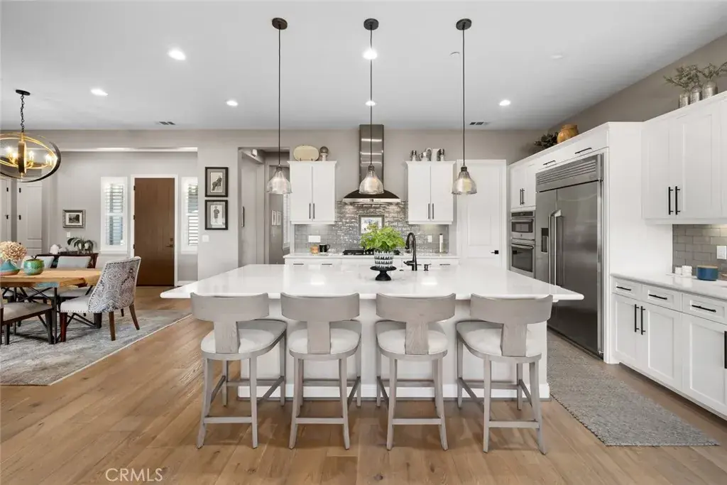 Modern Ranch meets California Coastal in this exquisitely upgraded Ventana floorplan, perfectly positioned to capture sweeping views of the vineyards, the shimmering lake and fountain, and the mountain range that frames the horizon. From sunrise to sunset, the scenery becomes a stunning natural backdrop—ever changing and always captivating. The home’s exceptional curb appeal sets an immediate impression of quality. Fresh exterior paint, stone-accented retaining walls, and a beautifully designed paver courtyard with a tranquil fountain create a welcoming entry that reflects the care and attention invested throughout the property. Inside, the chef’s kitchen features stylish white cabinetry with premium hardware, quartzite slab countertops, a generous island, a built-in refrigerator, and stainless appliances with a sleek range hood. The kitchen opens seamlessly to the great room, where a dramatic floor-to-ceiling stacked-stone fireplace adds warmth and architectural presence. Professionally designed interiors elevate every room. Automatic window treatments, plantation shutters, oak hardwood floors, and wallpaper-accented rooms create a sophisticated aesthetic. The optimized Smart-Space laundry room enhances convenience with custom cabinetry, a sink, and a built-in desk area along with a bay of cabinets in the garage for added storage. The outdoor living experience is a true highlight of this home. The covered patio functions as an additional living room, offering year-round comfort with a drop-down shade and generous space for dining or lounging. Beyond, paver pathways lead to a peaceful sitting area with built-in firepit overlooking the lake and fountain—an ideal vantage point to enjoy the reflection of the sun on the water and the dramatic silhouette of the mountains as the sky shifts throughout the day.