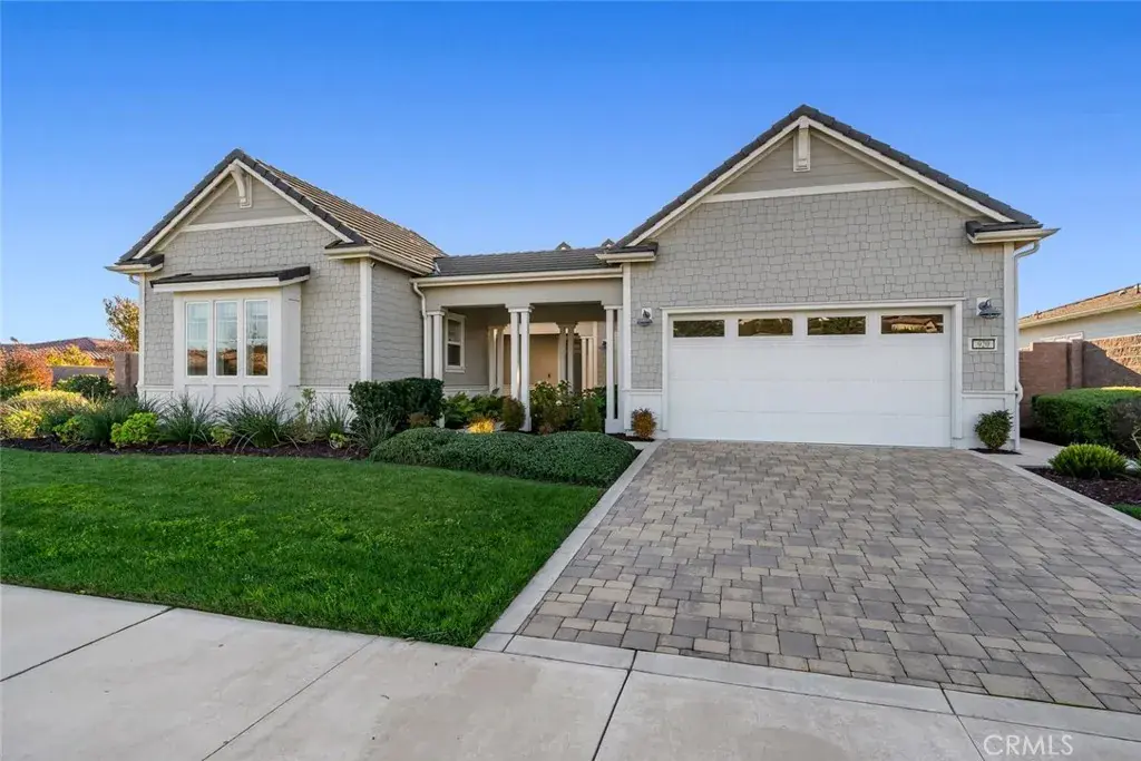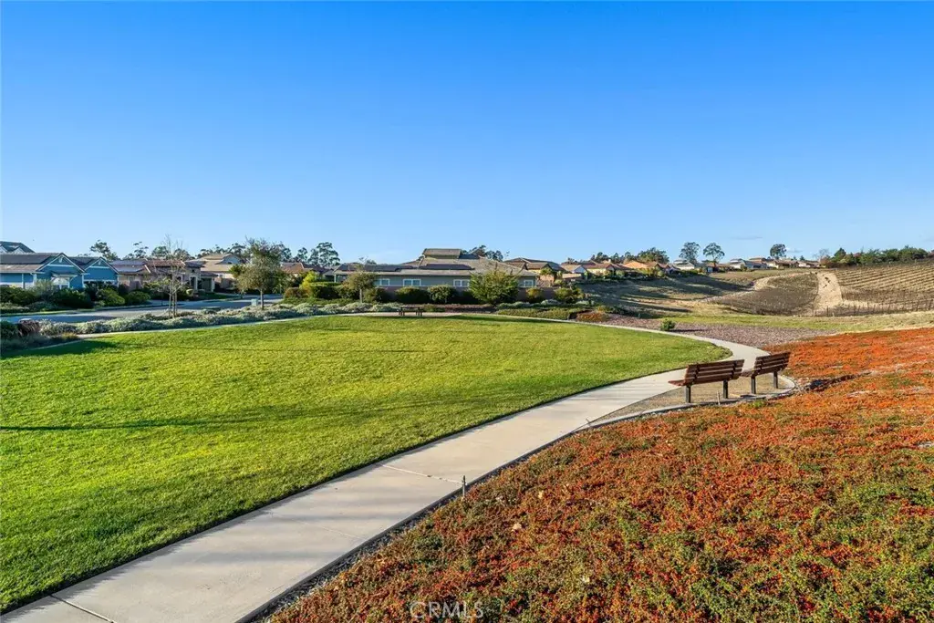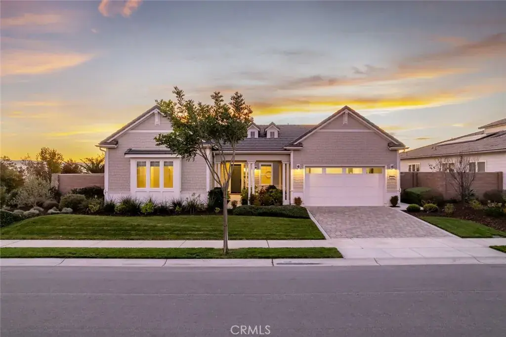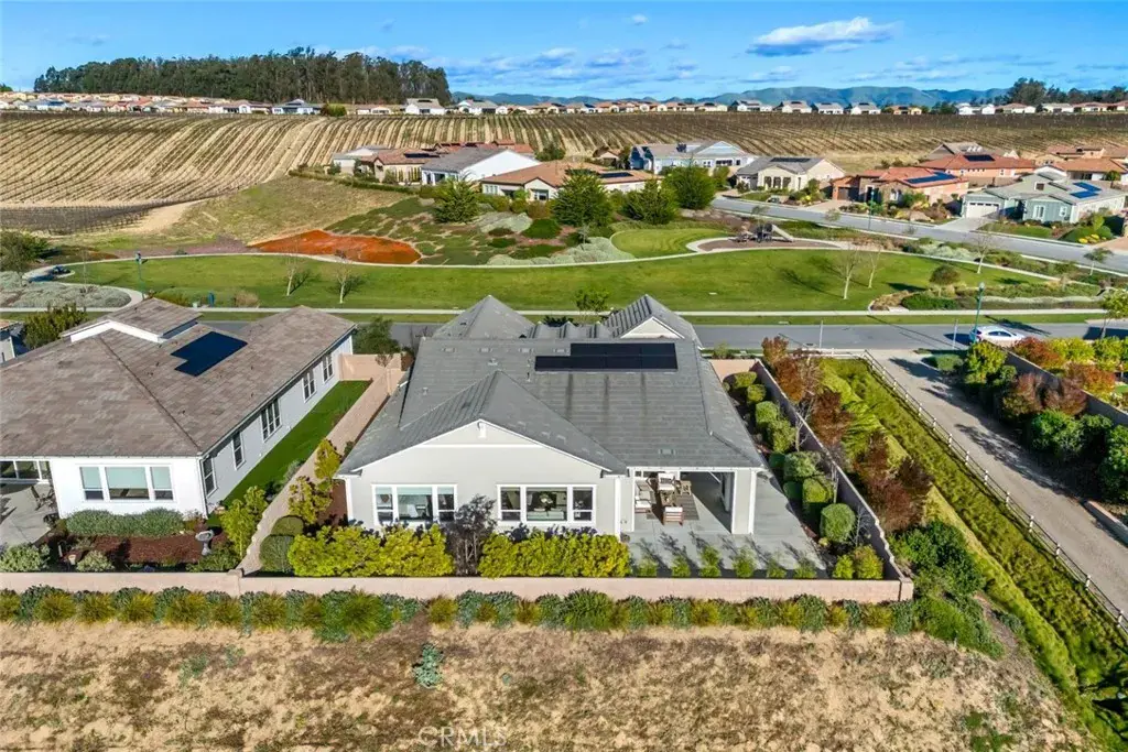 This elegant, coastal cottage-style home enjoys one of the most coveted settings—framed by open space on three sides, with an expansive park and vineyard just across the way and sweeping views of distant dunes and tree-lined horizons behind. A generous entry courtyard sitting area creates an immediate sense of welcome, leading into 2,696 sq ft of refined, open-concept living. Inside, desirable white oak hardwood floors set an elegant yet relaxed tone, guiding you into the light-filled living and dining spaces. The gourmet kitchen takes center stage with soft-close shaker cabinetry, quartz countertops, double-oven, an oversized island, and a walk-in pantry complete with a 50-bottle wine fridge. A well-designed “Smart Space” utility room offers laundry and a built-in office with desk area to further enhance your everyday comfort. Enjoy the restful, primary suite featuring a spa-inspired bath with stone-slab counters, double vanity, walk-in shower and a spacious walk-in closet. Beyond the main living areas, an oversized, air-conditioned guest casita awaits—accessible through its own private entrance and appointed with a generous sitting area, bedroom, and en-suite bath. Perfect for visiting friends, in-laws, creative pursuits, or simply curling up with a good book, this wonderfully flexible space enhances the home’s livability and offers endless possibilities. An expansive covered patio and outdoor fireplace invite year-round enjoyment of the tranquil backyard and scenic vistas. The home’s thoughtful design also includes a 3-car garage, whole-house water filtration, keyless entry door, garage cabinetry, included washer, dryer and refrigerator and solar energy. The result is a sanctuary where thoughtful design and breathtaking surroundings come together in perfect harmony.