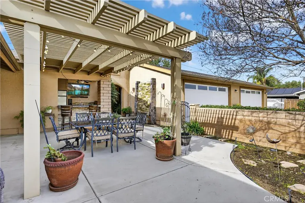 The side electric gate opens to the backyard and rear facing custom FOUR car garage, which is great for privacy. Between the house and garage is a porte-cochère with a wall waterfall. Great ambience to hear this from the covered patio, with custom bar including sink and refrigerator, as you enjoy the view of the hills with family and friends.