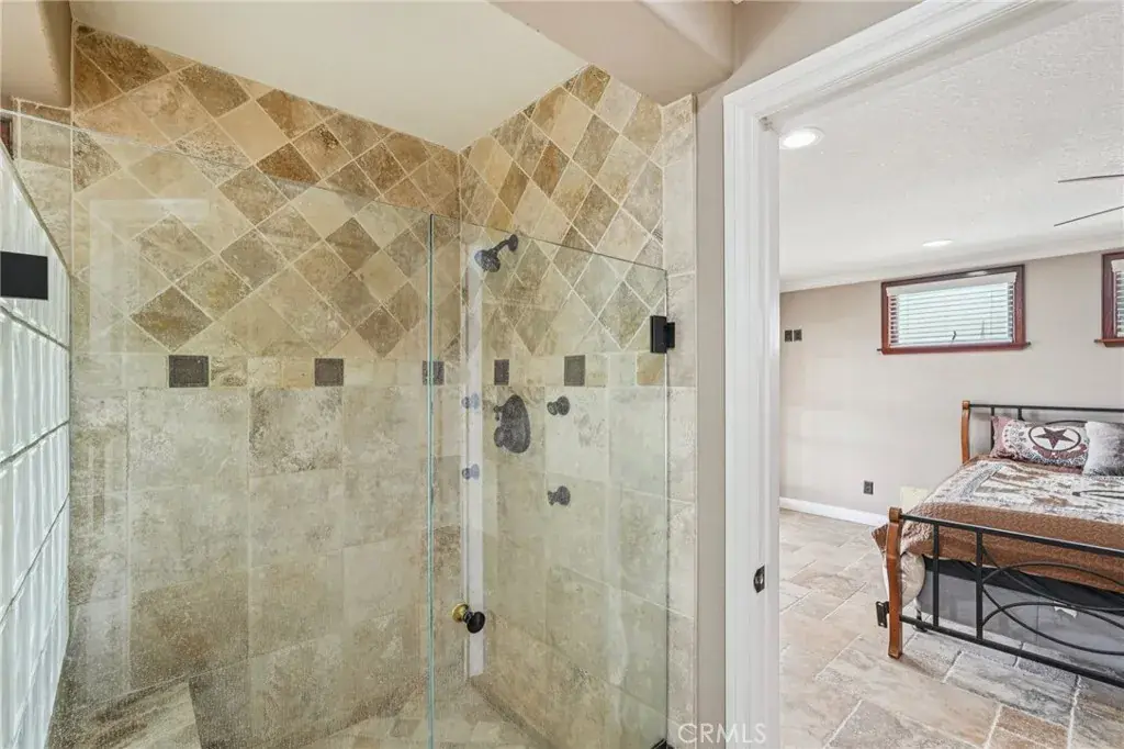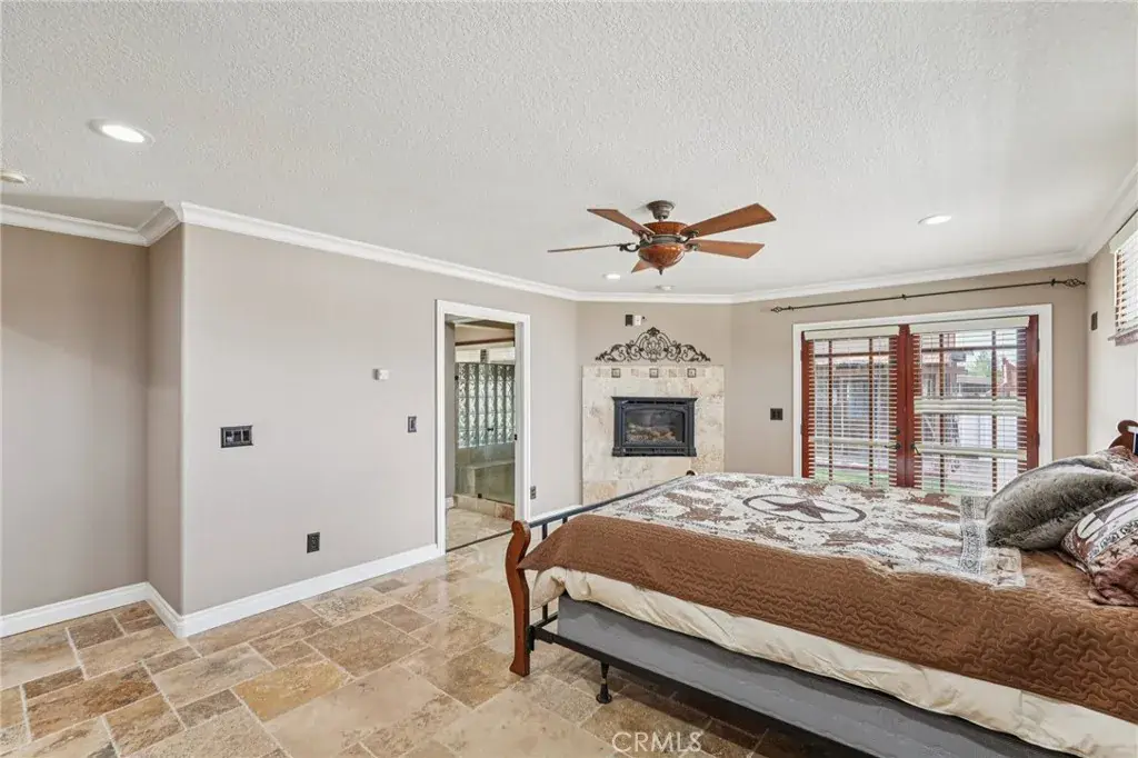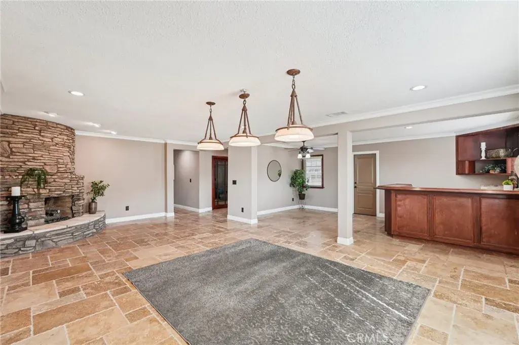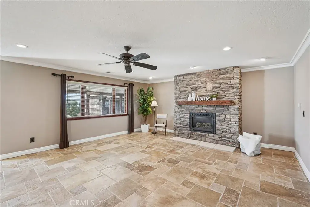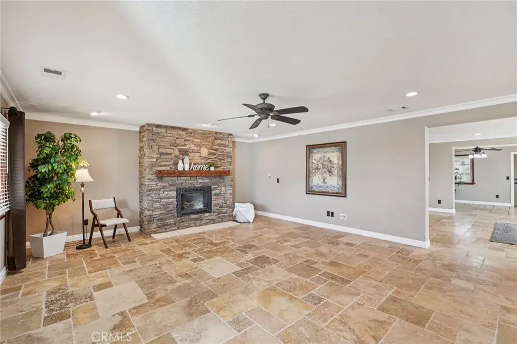 Warmth and character abound with three fireplaces—one in the family room, one in the living room, and one in the primary bedroom. The living room also features a full bar setup, ideal for hosting guests. One of the bedrooms has been converted into a custom office with stunning built-ins, providing an ideal workspace or creative retreat. Both bathrooms have been beautifully updated with stone and travertine finishes, adding a spa-like touch. Major system upgrades include a new A/C unit, heater, ducting, and water heater for comfort and peace of mind.