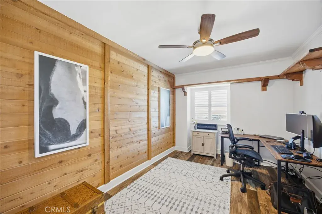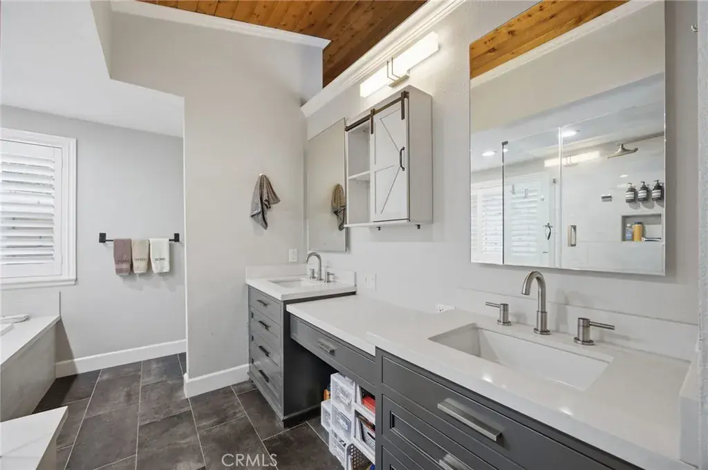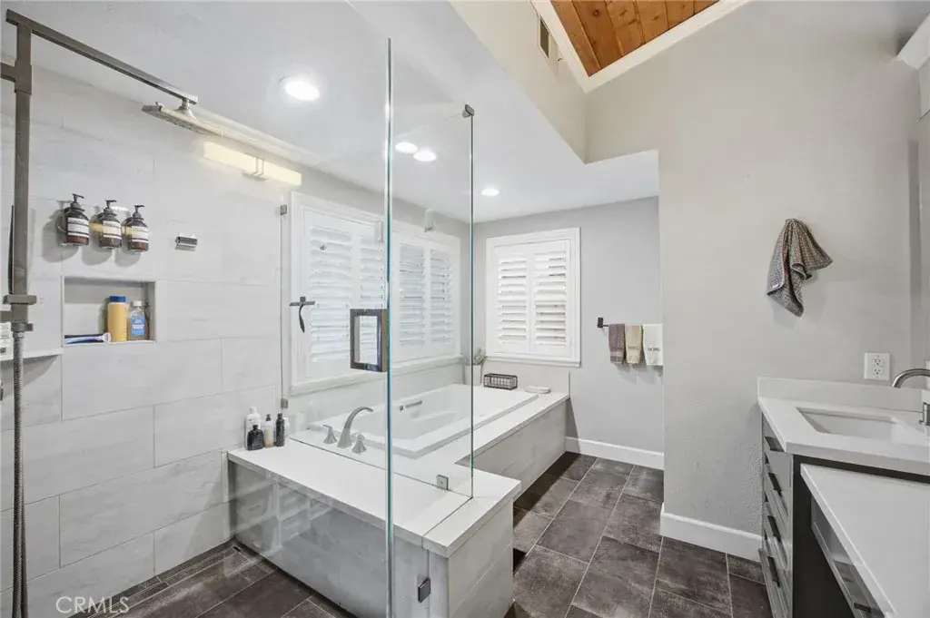 The primary suite is truly impressive, featuring beautiful wood ceilings, a spacious walk-in closet, and a fully remodeled spa-like bathroom. The primary bath includes lighted vanity mirrors, a custom glass-enclosed tiled shower, high-end fixtures, a dual vanity with a seated makeup station, and a luxurious jetted tub. The second primary suite is conveniently located on the opposite side of the home and includes its own private ensuite bathroom—ideal for guests or multi-generational living.