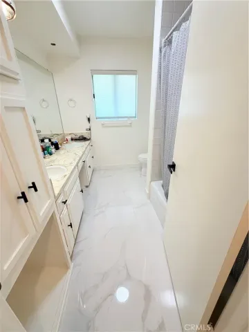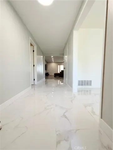 This beautifully remodeled, gated one-story home with a brand-new guest house offers four bedrooms and five bathrooms and has been expanded and updated with fantastic features throughout. A spacious tile-floor entry leads into a large living room featuring new tile flooring throughout the entire home and custom French doors with sidelights that open to an amazing yard with a putting green and newer exterior lighting.