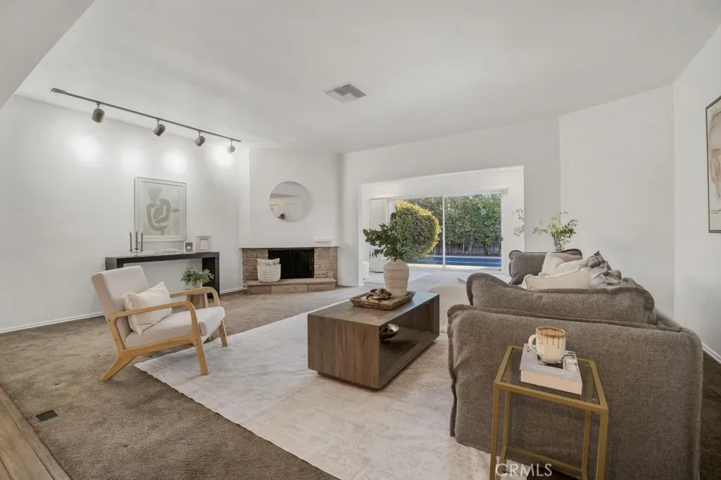 The expansive living room features a classic brick & stone fireplace, track lighting, and a large sliding glass door framing sparkling pool views — a room made for gathering and making memories. The separate den opens directly to the backyard, ideal as a media room, playroom, or casual retreat. The private office boasts stunning custom built-in cabinetry, shelving, and hardwood floors — an inspiring workspace that easily doubles as a 4th bedroom.