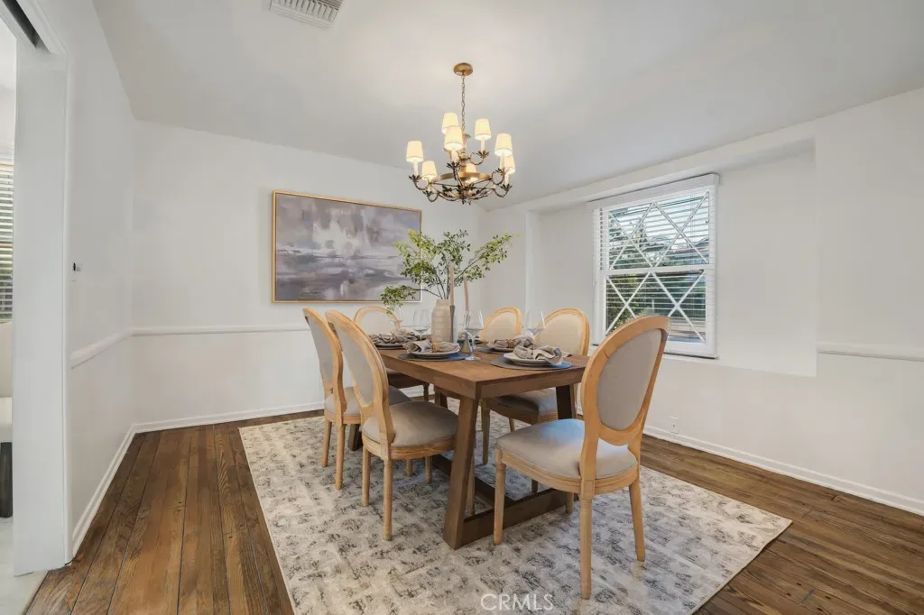 Step inside to a welcoming foyer with rich hardwood floors and a warm gold flush-mount fixture setting an elegant tone. The formal dining room impresses with a statement gold chandelier, gorgeous hardwood floors, and a charming diamond-pane window — designed for special occasions. The charming kitchen features white shaker-style cabinetry, black hardware accents, generous counter space, and a sunny breakfast nook perfect for morning coffee. A dedicated laundry room with utility sink adds everyday practicality.