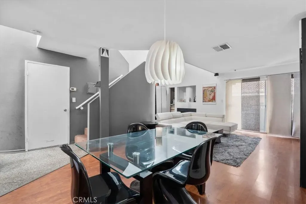 Step inside to an inviting living area filled with natural light that highlights the rich wood-style flooring and stylish finishes throughout. The living room features dramatic volume ceilings, an architectural focal wall, and direct access to outdoor space — perfect for relaxing or entertaining guests. Adjacent is a sleek dining area with designer lighting and room for a full-sized table. The kitchen presents clean lines, ample cabinetry, and plenty of countertop space, while the thoughtful layout flows effortlessly into the living and dining zones. The generous primary suite includes an ensuite bath, excellent closet space, and privacy from the main living areas. A second full bathroom serves guests and adds convenience.