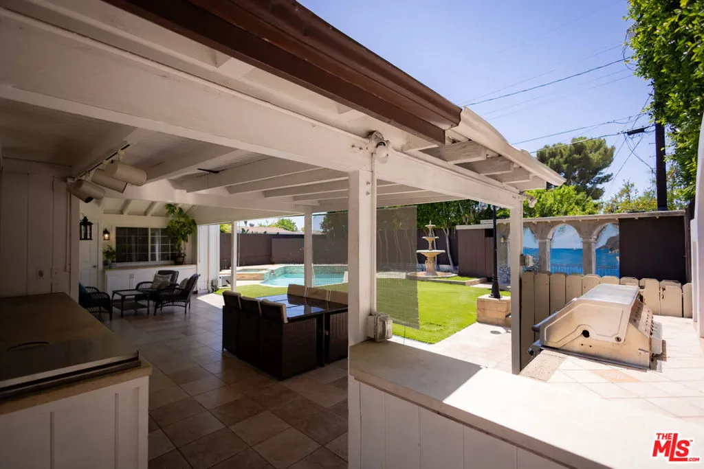 Welcome to this well appointed and truly turnkey 4 bedroom, 5 bathroom home located just minutes from the vibrant NOHO West. Blending comfort, space and outdoor luxury, this home offers a rare opportunity in one of the Valley’s most convenient neighborhoods. The main level opens with a formal foyer and leads to two generously sized bedrooms, both featuring private en-suite bathrooms ideal for guests or extended family. A third guest bathroom is located just off the kitchen, providing easy access while entertaining. The home features a separate fully upgraded kitchen with modern cabinetry and stainless steel appliances. Enjoy everyday living and entertaining in the expansive open concept layout that seamlessly connects a large living room and the dining area. A den with a fireplace offers a relaxing spot for everyday use or entertaining. Downstairs, a rare finished basement adds valuable bonus space, ideal for a home gym, media room, storage, etc. The main level third bedroom currently configured as kids room and bedroom side by side offering a flexible setup that can be easily converted back to a single bedroom with a walking closet. Upstairs, the private primary suite serves as a peaceful retreat, featuring a walk-in closet, spa-style bath with jacuzzi tub, glass shower and abundant natural light. Step into the backyard and discover a true entertainer’s paradise: a covered patio with ceiling fan, built-in BBQ island, bar with sink, heated pool with swim jet, and a cascading jacuzzi spa. The layout offers plenty of space for lounging, dining and enjoying Southern California’s indoor-outdoor lifestyle. Additional features include an attached garage, 30 paid off solar panels, multi-zone HVAC, two tankless water heaters and a security camera system. Located near studios, the NoHo Arts District, shops, dining and major freeways, this turnkey home delivers flexibility, character and resort-style living in the heart of North Hollywood.